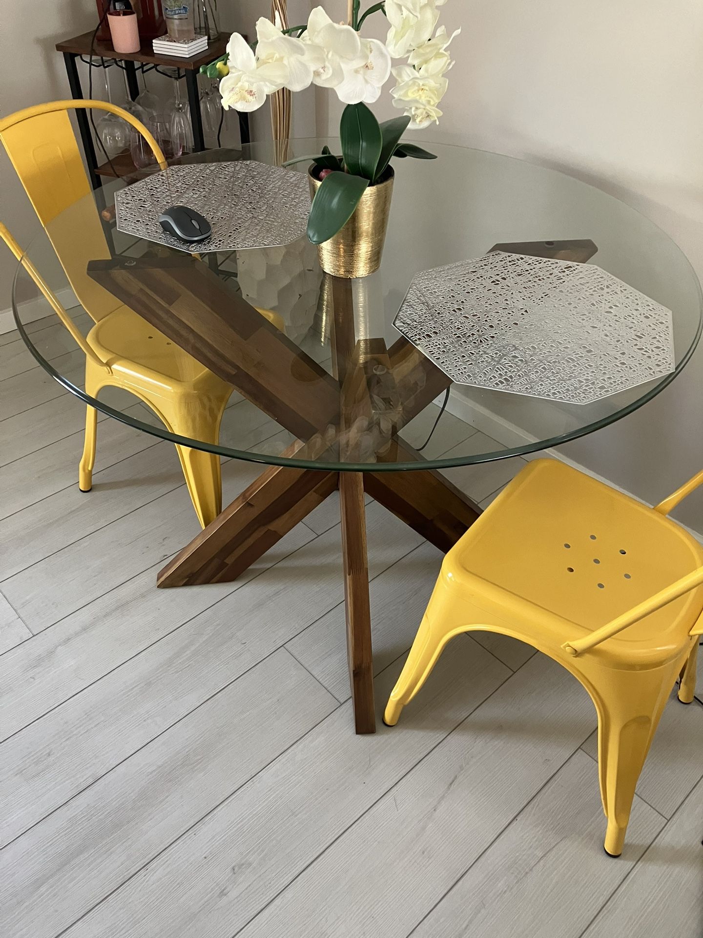 Beautiful Pier One dining room table. Center legs pull apart into 2 pieces for super easy transport. Can fit 4 chairs. This table can be paired with any chair you desire. I am throwing in the 2 yellow chairs for free, if you want them.