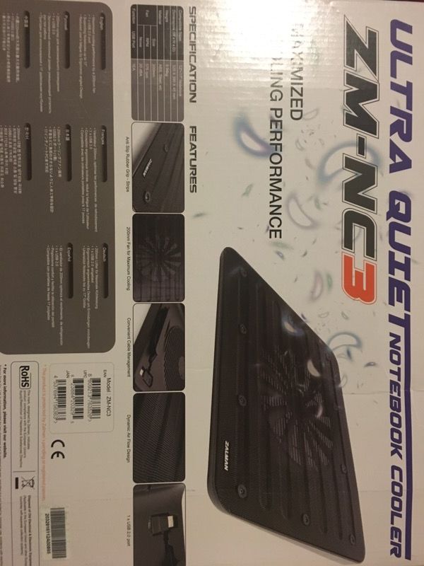 Ultra quiet notebook/laptop cooler USB port 12"-17" compatible sizes Fan size 200mm Anti slip rubber Cable management organizer Zalman $20 obo Multiple available