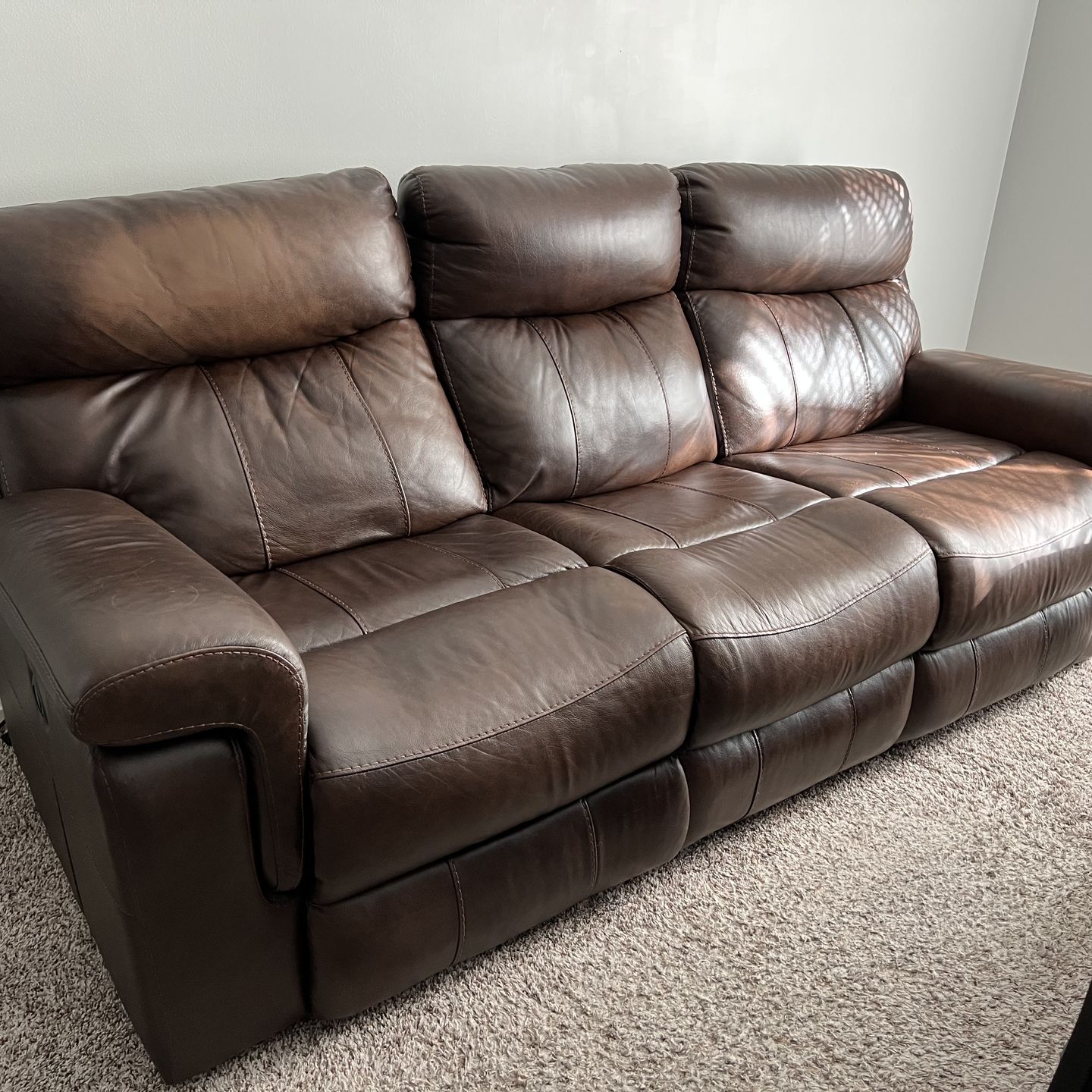 Used. Electrical Sofas that recline. Possible broken piece of wood on the headrest of the right corner recliner seat. Still works and reclines. 3 Seat Sofa - The 2 side seats recline all the way. The middle seat does not recline. 2 seat sofa- both seats recline all the way. Paid $2500 new. Asking $500 OBO. Moving Sale.