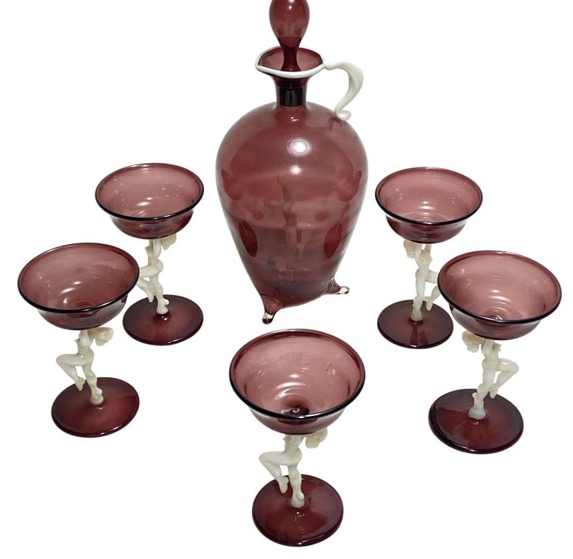 Introducing a vintage Lauscha Bimini purple glass liqueur decanter set by Fritz Lampl from the 1920s, featuring beautifully crafted nude lady figurines made of blown glass, set includes a decanter with stopper and 5 glasses, in used good condition. Measures: Decanter with stopper: Height 8”, Diameter 3 1/4”, Weight 4 oz 5 Glasses: Height 3 3/4”, Diameter 2 1/4”, Weight 1.1 oz each Item shown in pictures is the actual item you will receive. For questions or concerns, please reach out. We are here to help. If you are not satisfied with your purchase, please contact us directly. Customer happiness is our priority. Thank you! The Happy Face Shop