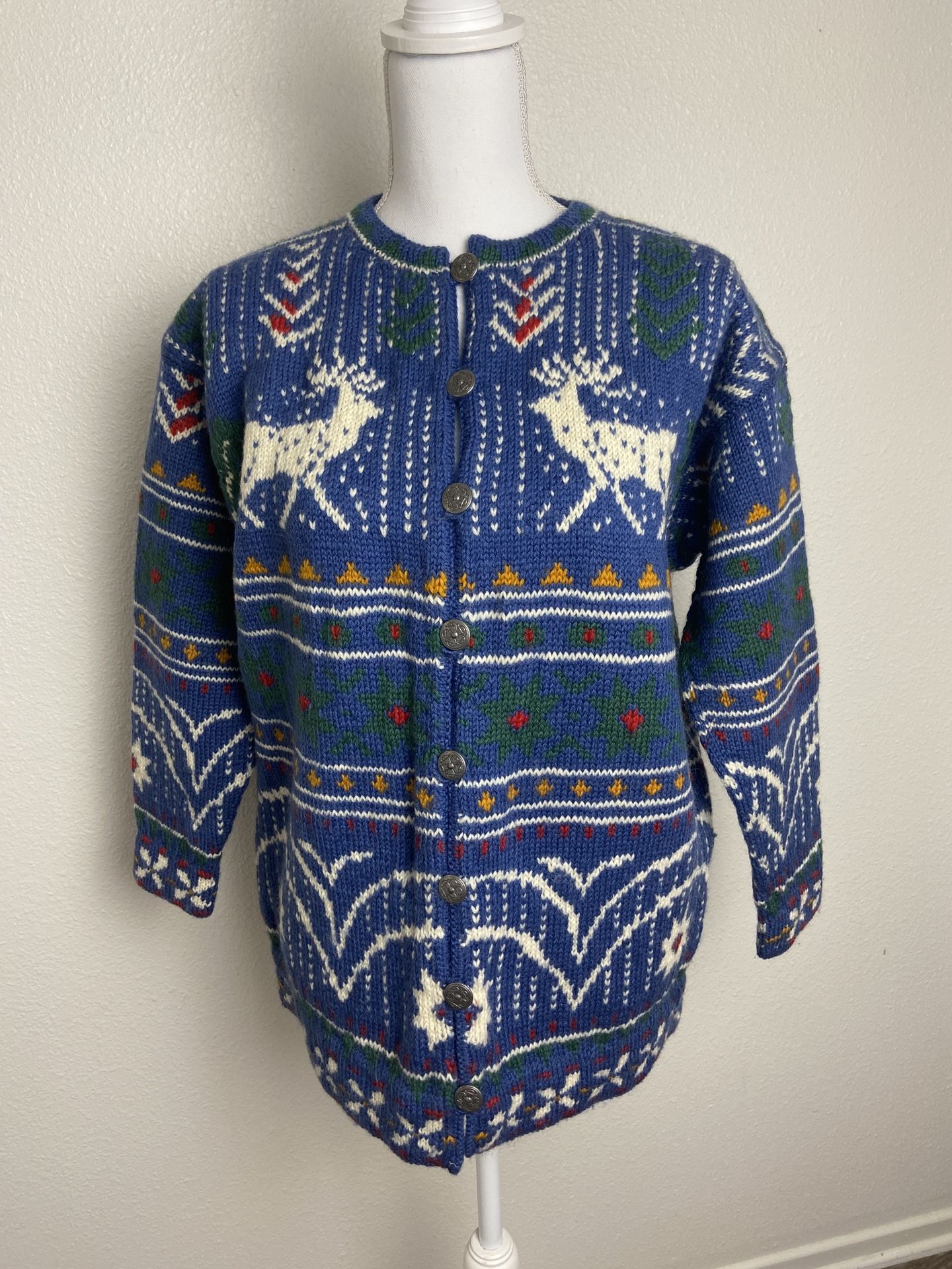 Unique Scandinavian pattern. Metal buttons closure detail . 100% Wool. Size M/L ( tag - size M). 22” pit to pit. 27” length from shoulder. Excellent condition.