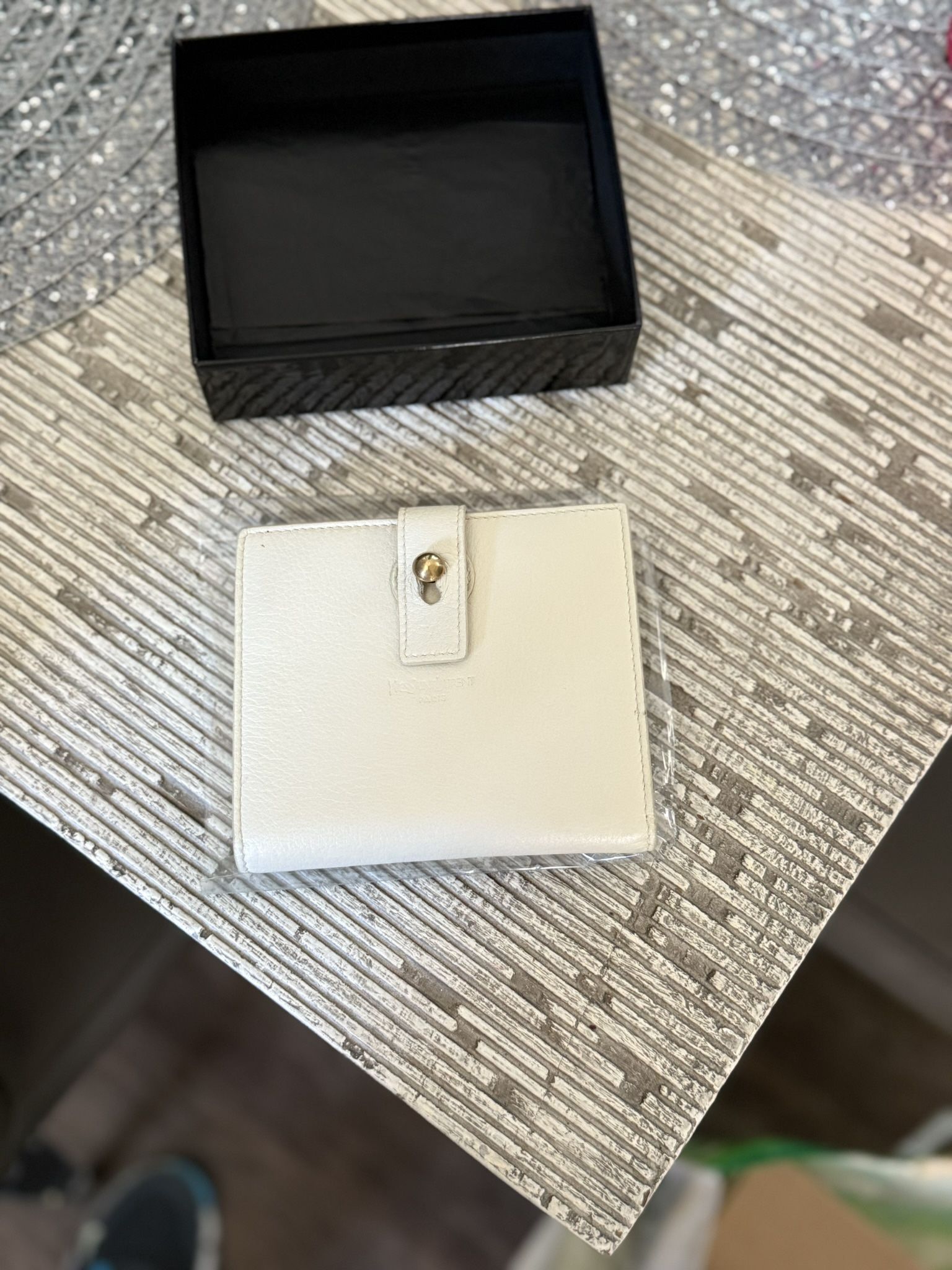 New in box. genuine Yves Saint Laurent (YSL) flap wallet in off-white (or “ivory”) grained leather, from their Rive Gauche line. It’s a classic continental-style bifold
