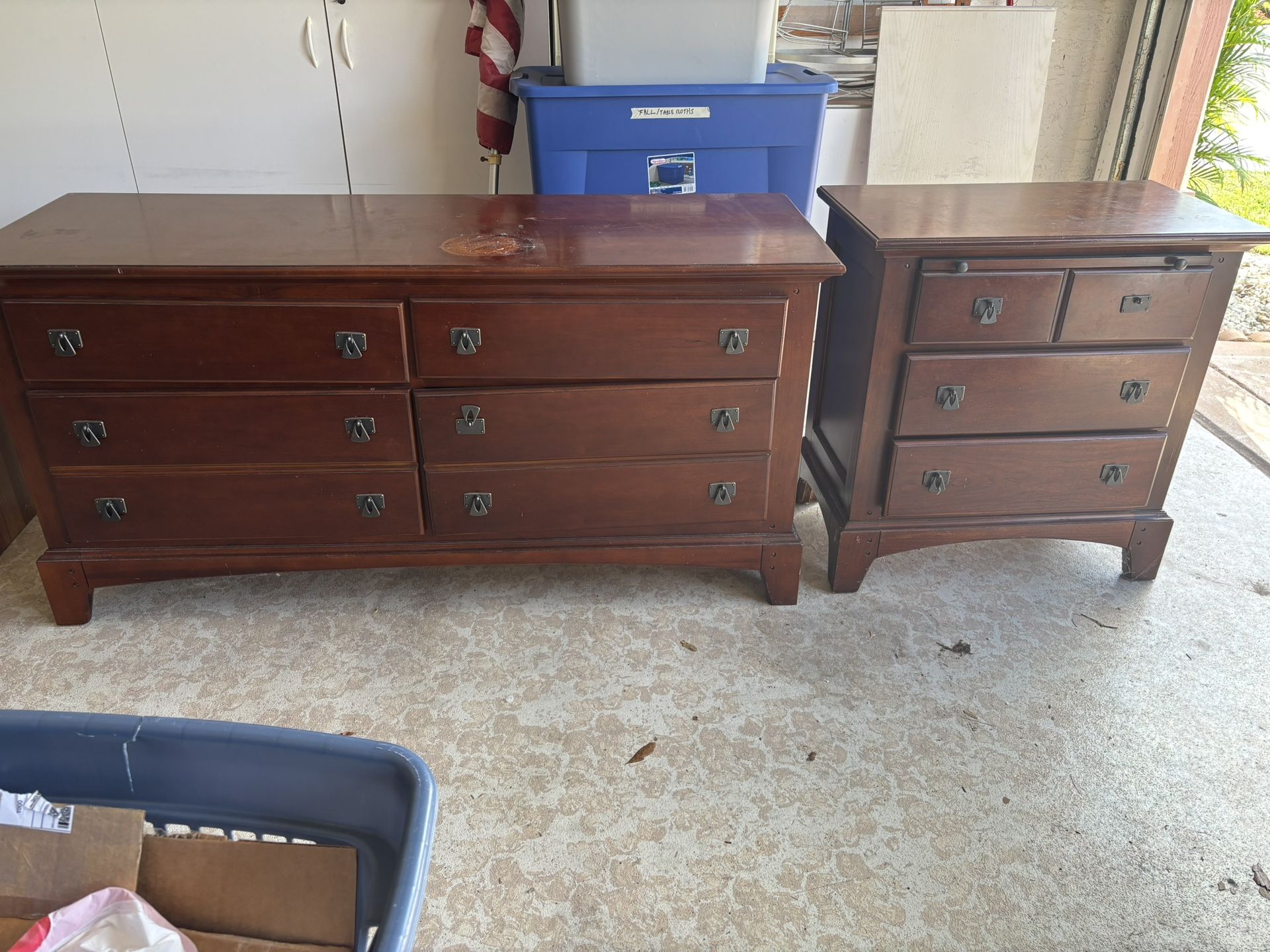matching brown bedroom dresser set. Classic design with a rich wood finish that works well with traditional, modern, or transitional décor. Both pieces offer plenty of storage space with drawers that are deep and functional — perfect for clothes, linens, or extra storage. Sturdy construction and built to last. Great option for a primary bedroom, guest room, or rental property. Condition: see picture for finish damage as picture on top of larger drawer piece. used with normal minor wear consistent with age. Structurally solid and all drawers open and close properly.