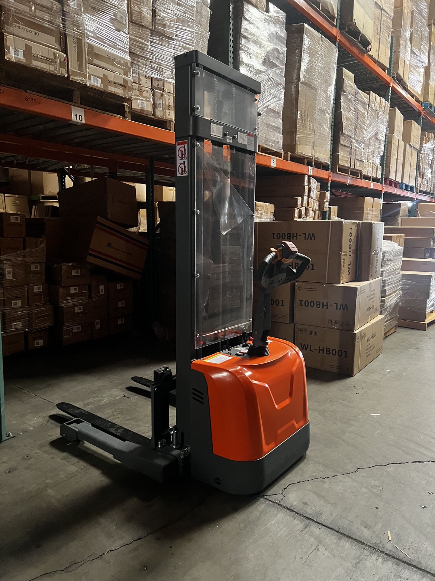 Price is for used model shown in picture New model price is $5,200 THE BEST CHOICE FOR NARROW SITE 650-watt drive motor, 2,200-watt lift motor. Forks are adjustable to fit most pallets. Use GEL batteries that require no maintenance. Compact and agile, with a 52.9" turning radius for efficient operation in tight spaces. The display shows working hours, battery levels, and low-voltage alerts. DIMENSIONS Overall Length: 70.3" Recommended Aisle Width: 88.3" Turning Radius: 52.9" Max. Lifting Height: 118'' Mast Height Lowered: 84.4'' Mast Height Raised: 143.5'' Load Center: 23.6" Ground Clearance: 2.56" FORKS Fork height, Lowered: 2.8'' Adjustable Forks: 7.8"-31.5" Thickness: 1.3" Width: 3.9" Length: 42" STRADDLE LEGS Height: 4.7" Adjustable range: 44" - 60" FEATURES Smooth rolling polyurethane wheels; 180° steering arc. High component integration for easy maintenance and repairs. 110V Built-in Charger. 6 hours of service per charge: two 12-volt, 105 Ah rechargeable GEL batteries. Safety-enhancing warning lights and buzzer included. SPEED Travel Speed (laden/unladen): 2.8/3.1mph Lifting speed(laden/unladen) : 3.5/5.9inch/s Lowering speed(laden/unladen) : 5.9/4.3inch/s SPECIFICATIONS Not explosion proof. This forklift is designed to be used on flat ground, avoiding uneven grounds with potholes or large ramp. Normal Ambient temperature shall not be higher than +104°F and no lower than -13°F. Fully charge battery before use to avoid damaging cells. Charger plugs into standard 110V-120V outlets. Charge the forklift once a month even it's not in use.