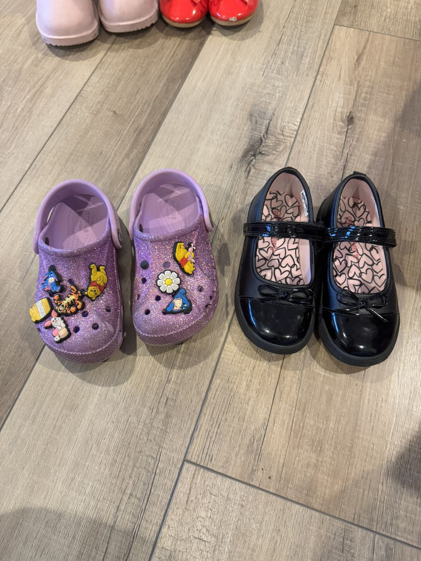 Carter's strap dress shoes in excellent condition barely worn Purple glittered crocs in good condition Pet and smoke free home