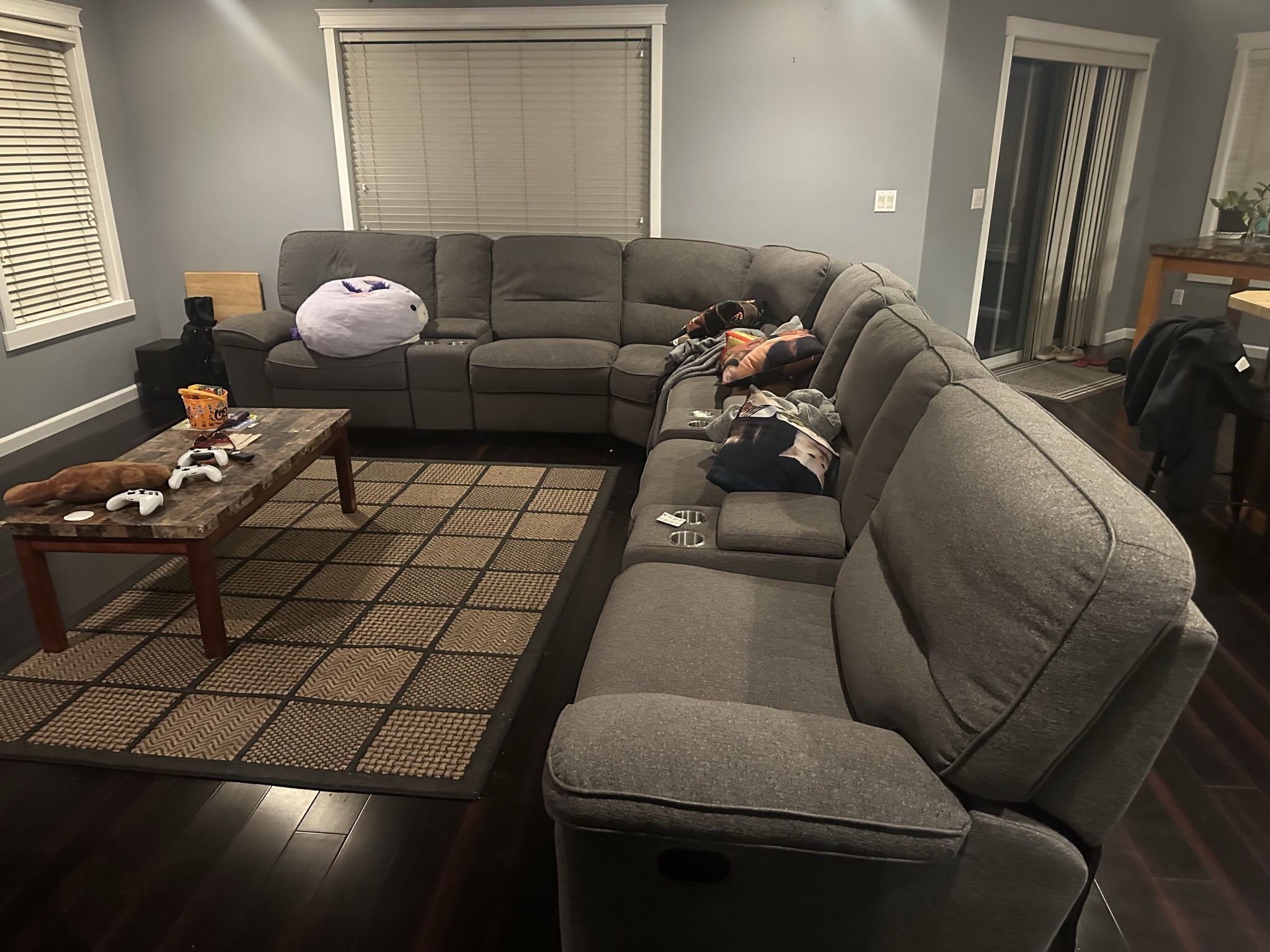 Only used for about 1 year, basically new. Total 9 pieces with 6 cup holders and 4 recliner seats. Need about a 10 ft by 7 ft area to fit comfortable