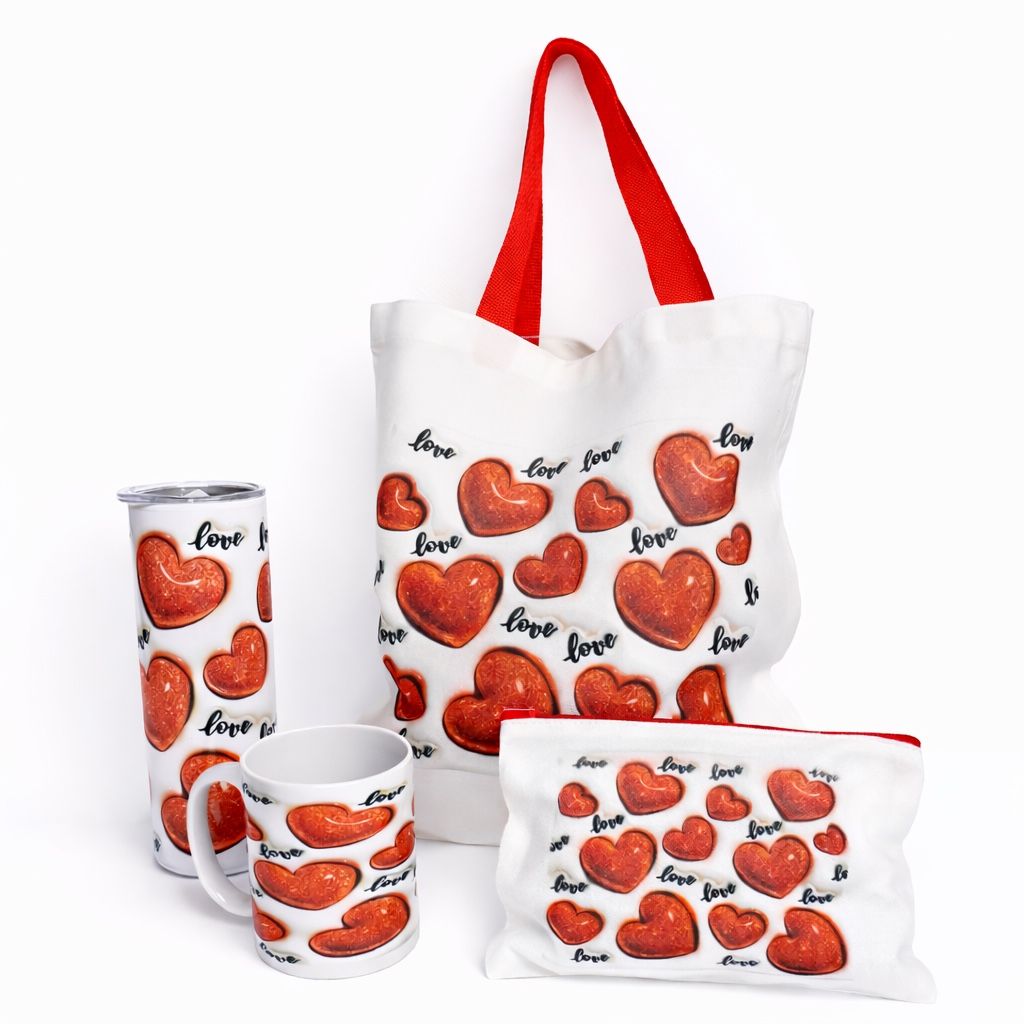 Valentine’s Day Gift Set – Love Heart Tote Bag, Mug, Tumbler & Makeup Pouch | Handmade Sublimation Set
