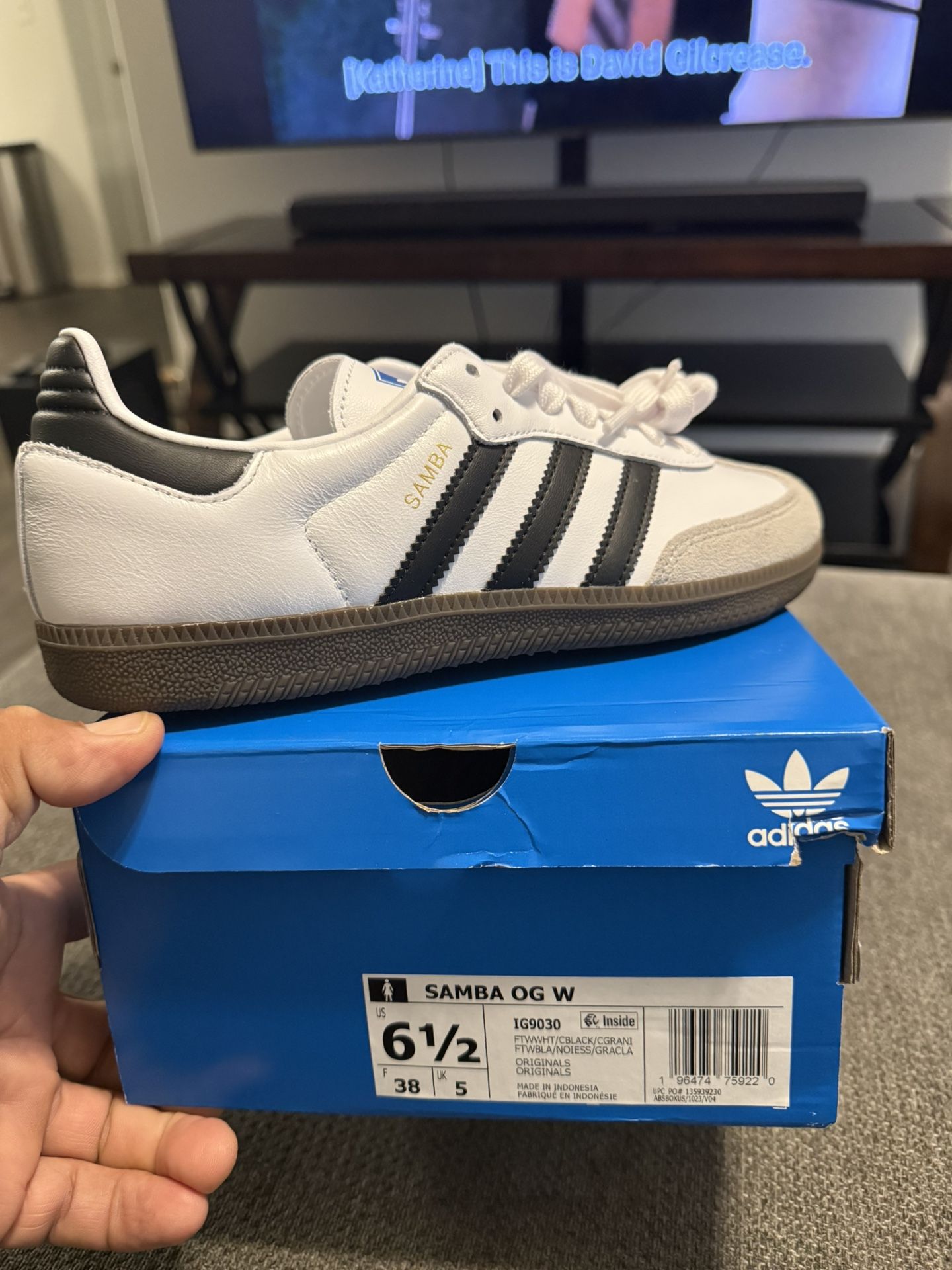 Adidas Samba OG (Women’s) – Size 6.5 Condition: Brand New / Never Worn Color: White/Black (Classic OG look) Model #: IG9030 For sale is a brand new pair of Adidas Samba OG W. These are one of the most popular and hard-to-find styles right now. Shoes are 100% authentic, only taken out for photos. Comes with original box. • Women’s Size 6.5 (EU 38) • Gum sole • Premium leather upper • Retro classic style • No flaws, no creases Price: $50 Pickup in the Lake Elsinore / Inland Empire area. Message me if interested!