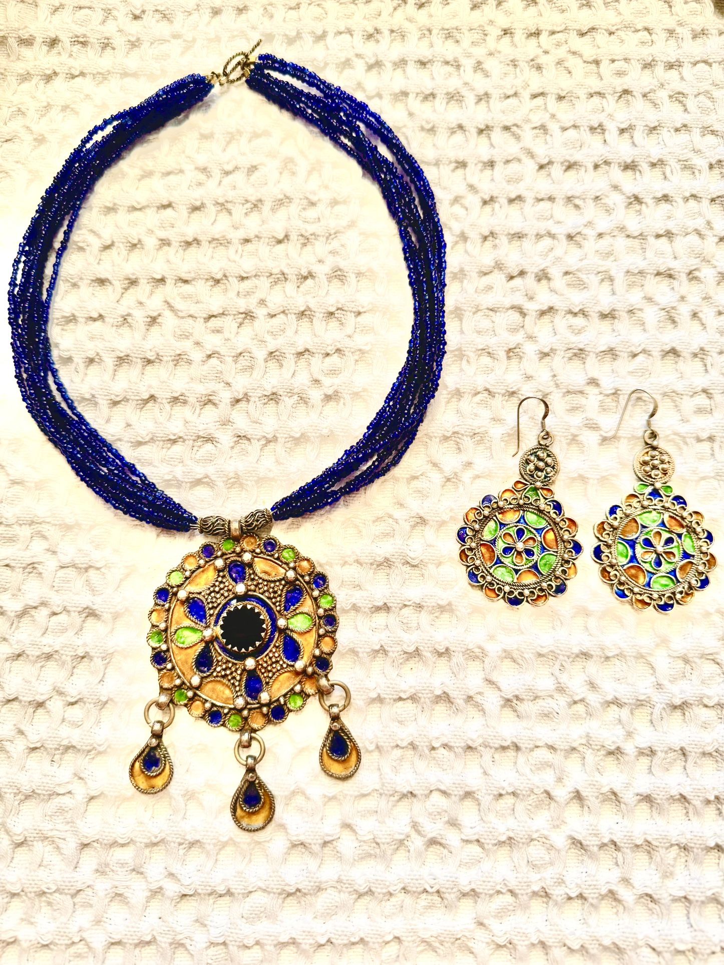 Necklace of six strings of tiny lapislázuli tiny beads attached to a gorgeous fascinating medallion with a round lapislázuli stone in the center of the medallion decorated with vibrant green, beige and blue tones. This piece is made of sterling silver . Certainly a conversation piece and very attractive that will caught the eyes of everyone where you go. The necklace measures 18” Long + 3” medallion. The measurements of the earrings are 2” long. This piece was purchased over thirty years ago in Morocco making it a unique jewelry.