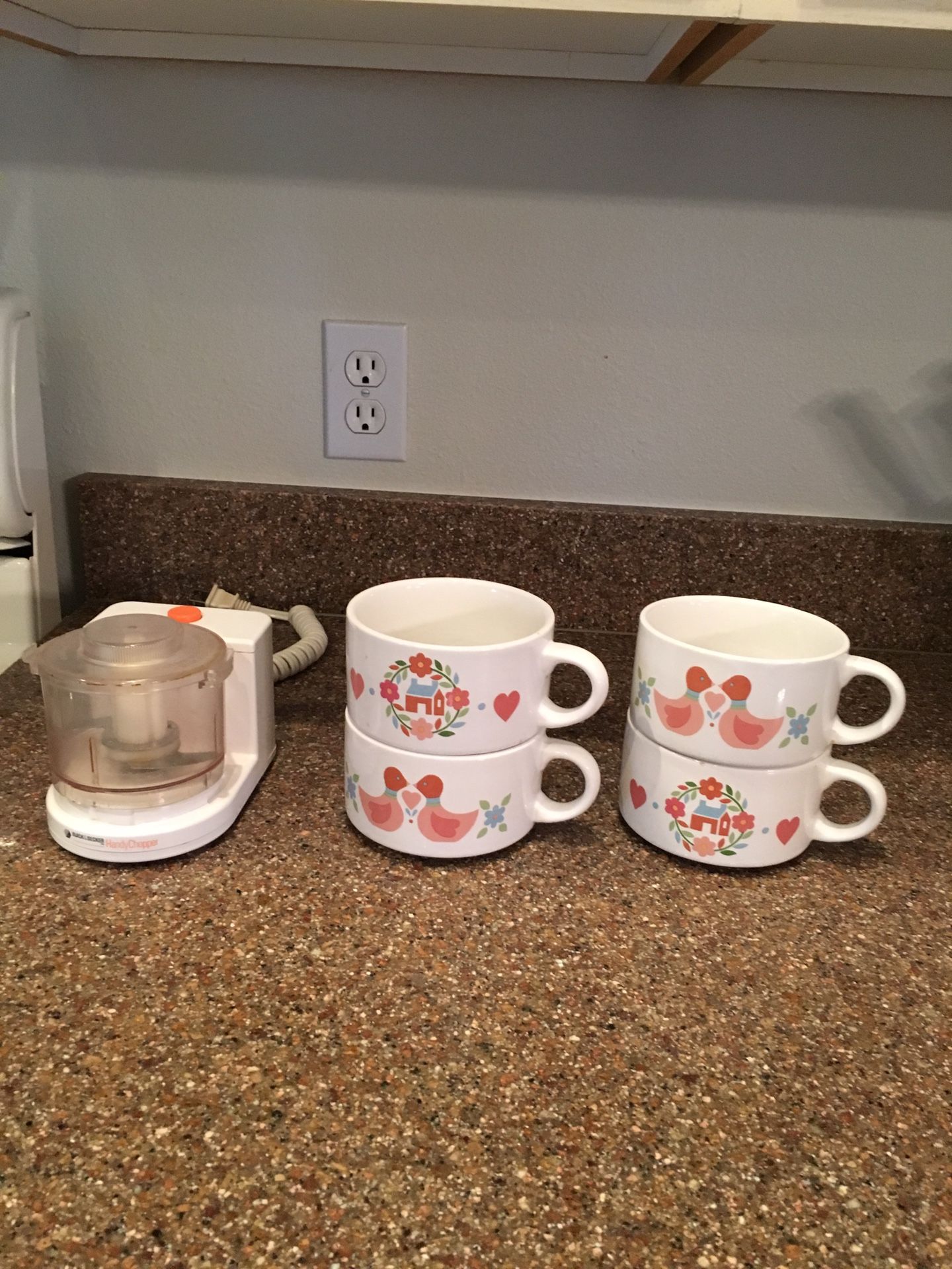 In pretty good shape. 8.00 for chopper and 5.00 for bowls
