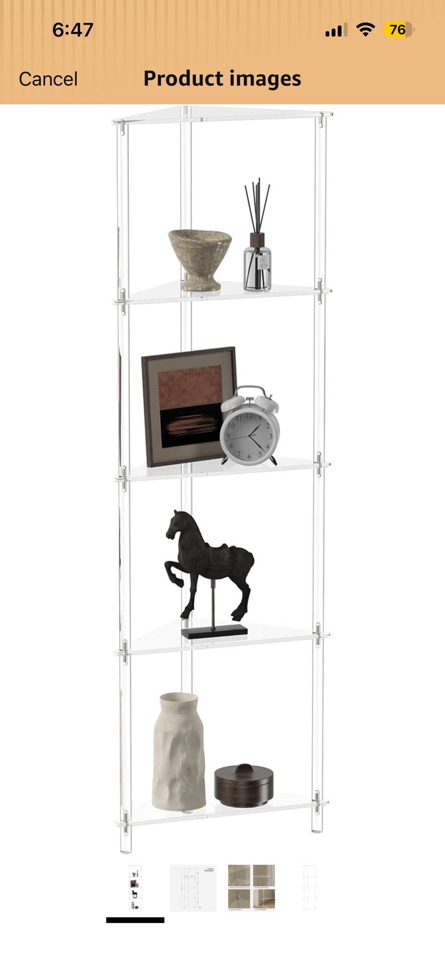 Elgaf Acrylic 5-Tier Corner Shelf Stand - 11.7'' W Corner Display Shelves Storage Shelf for Collectibles, Plants, Books, 11.7’’ D x 11.7'' W x 53.3'' H, Triangle, Clear Will take post down when sold Pick up gray and empire If negotiating must pick up at door will meet if paying asking price