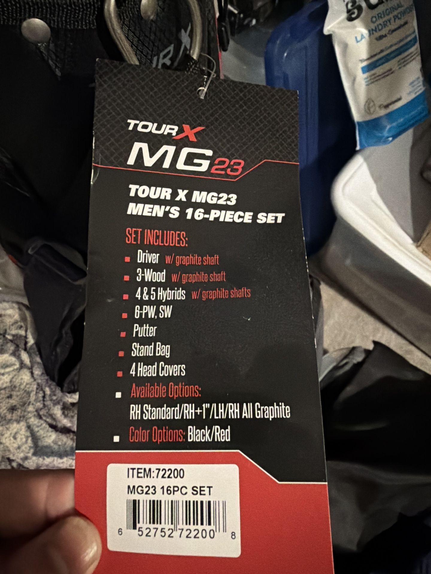 Tour X MG-23 16PC Package Set 1 - 460cc Black PVD Driver with Graphite Shaft 1 - Low Profile Black PVD Fairway Wood with Graphite Shafts 2 - Perimeter-Weighted Black PVD Hybrids with Graphite Shaft 6 - Deep Cavity Stainless Steel Iron 1 - Offset Alignment Putter 1 - Deluxe Lightweight Stand Bag with Dual Strap & Rain Hood 4 - Matching Head Covers