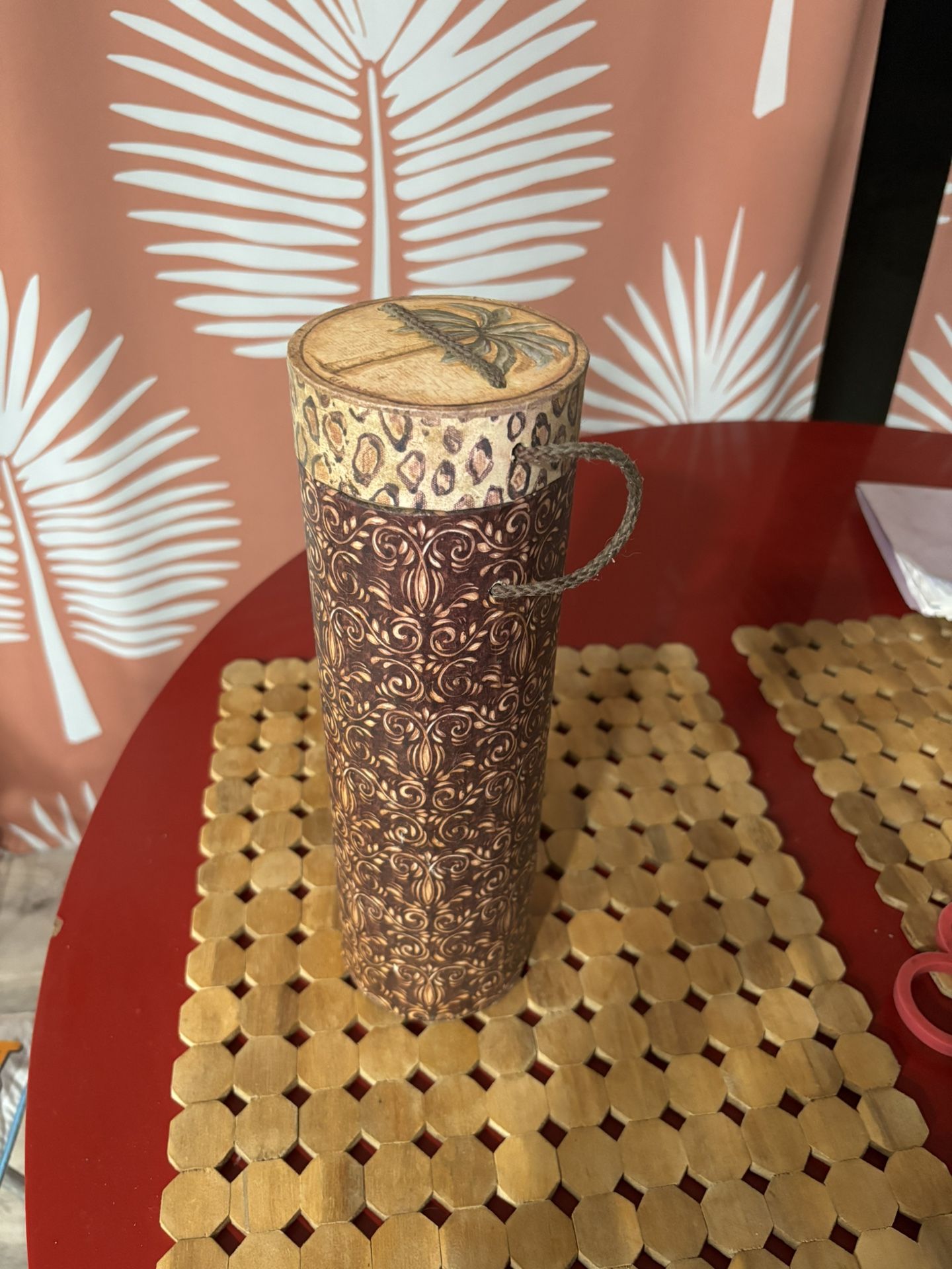 The case has an attached top with handles so you could carry a bottle of wine to offer a host gift or use it to hold kitchen tools, etc. Slightly less than 13” tall, diameter 4”.