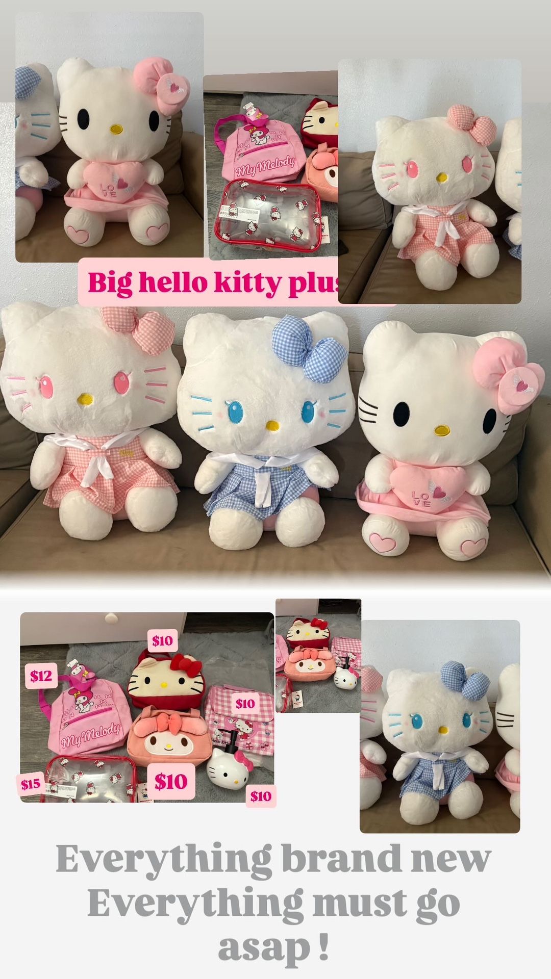Hello kitty big plushy Hello kitty accessories Each item different price Items firm Everything must go !