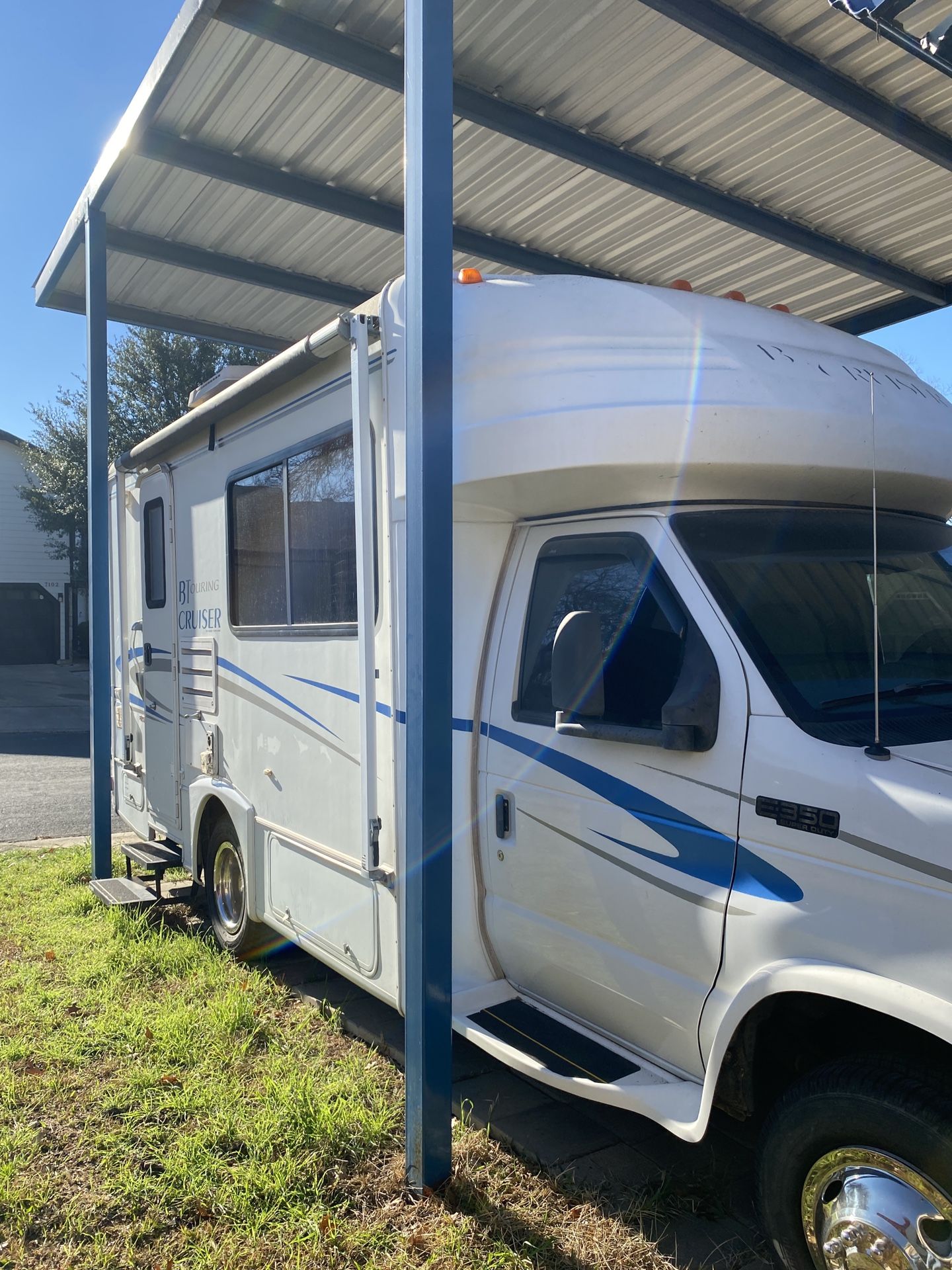 Automatic transmission 10 V Ford F350 engine. In Exeter condition inside and out. Has small cosmetic damage on back left bumper. Everything works as it should. Well maintained. No leaks. I have the original manuals from the factory for the RV. I have all the maintenance receipts. Research indicates that a unit of this age and mileage is worth between 10 and 15,000. The price is firm at 12,000. This RV is an excellent choice for two people and a couple of pets. It would not be the normal unit for a family with kids. It has two sofas that fold out to make two large beds. It has no table that makes into a bed. It has a removable table that fits under one of the sofas. We prefer to use TV trays for meals.
