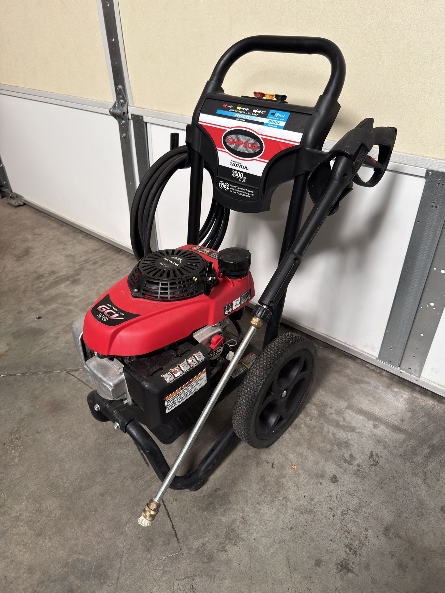 Honda powered 3000psi pressure washer. Runs great, started up with no hesitation two days ago. This unit is practically new and used for under 10 hours. Current version is $400 at Tractor Supply