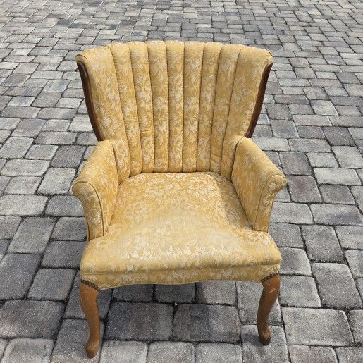 Add a touch of timeless elegance to your space with this stunning vintage accent chair. Upholstered in a rich golden damask fabric, this piece showcases a beautiful floral pattern that exudes classic sophistication. The channel-tufted backrest creates an eye-catching, fan-like silhouette that offers both comfort and visual appeal. Crafted with a solid wood frame, the chair features gracefully rolled arms and Queen Anne-style cabriole legs that enhance its antique charm. Natural wear on the legs and upholstery adds character and authenticity, making this chair a perfect statement piece for vintage-inspired interiors, eclectic spaces, or restoration enthusiasts. Features: *Channel-tufted backrest with vintage fan design *Golden yellow damask upholstery with floral pattern *Rolled arms *Solid wood frame Dimensions: Total: 34"H x 29"W x 26"D Seat: 15"H x 19"W x 20"D