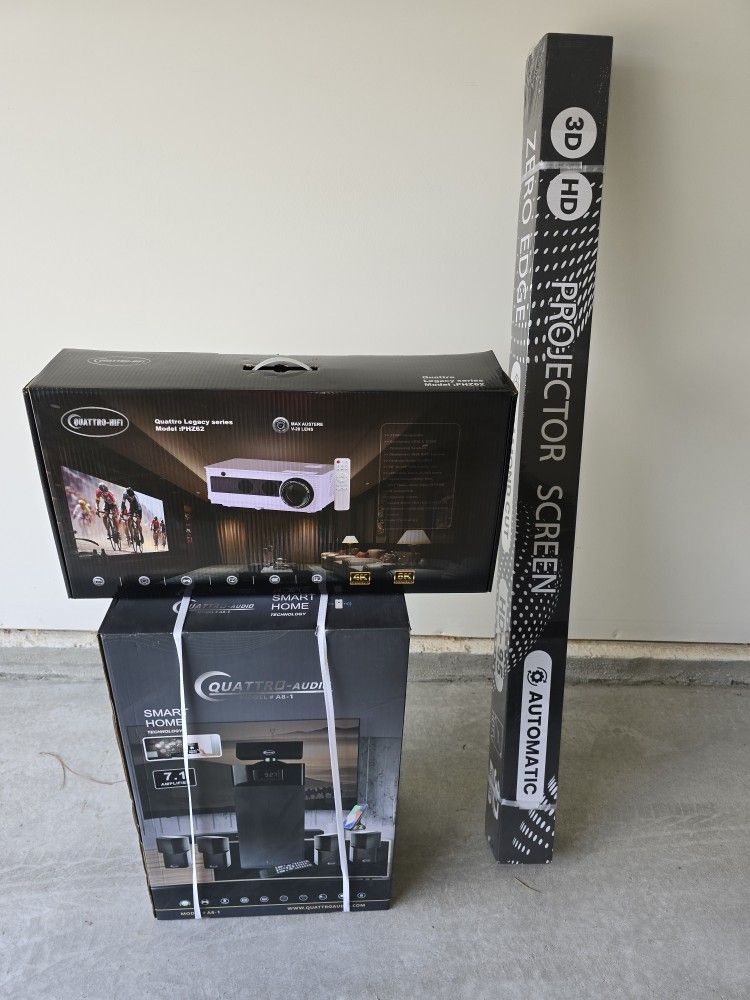 Brand new, never opened home theater package. Items include Quattro projector, Quattro 7 piece surround sound smart home, and 72" to 100" 3D HD projector screen.