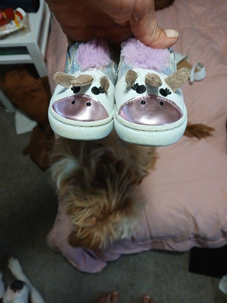 so both of these pairs of shoes of very lil to no wear an tear on them as neither were worn very much at all. The unicorn shoes are a size 5 and the sandals are a size 6. Were asking for $15 for the pair or $10 each if sold individually. please serious inquiries only thank you and God bless