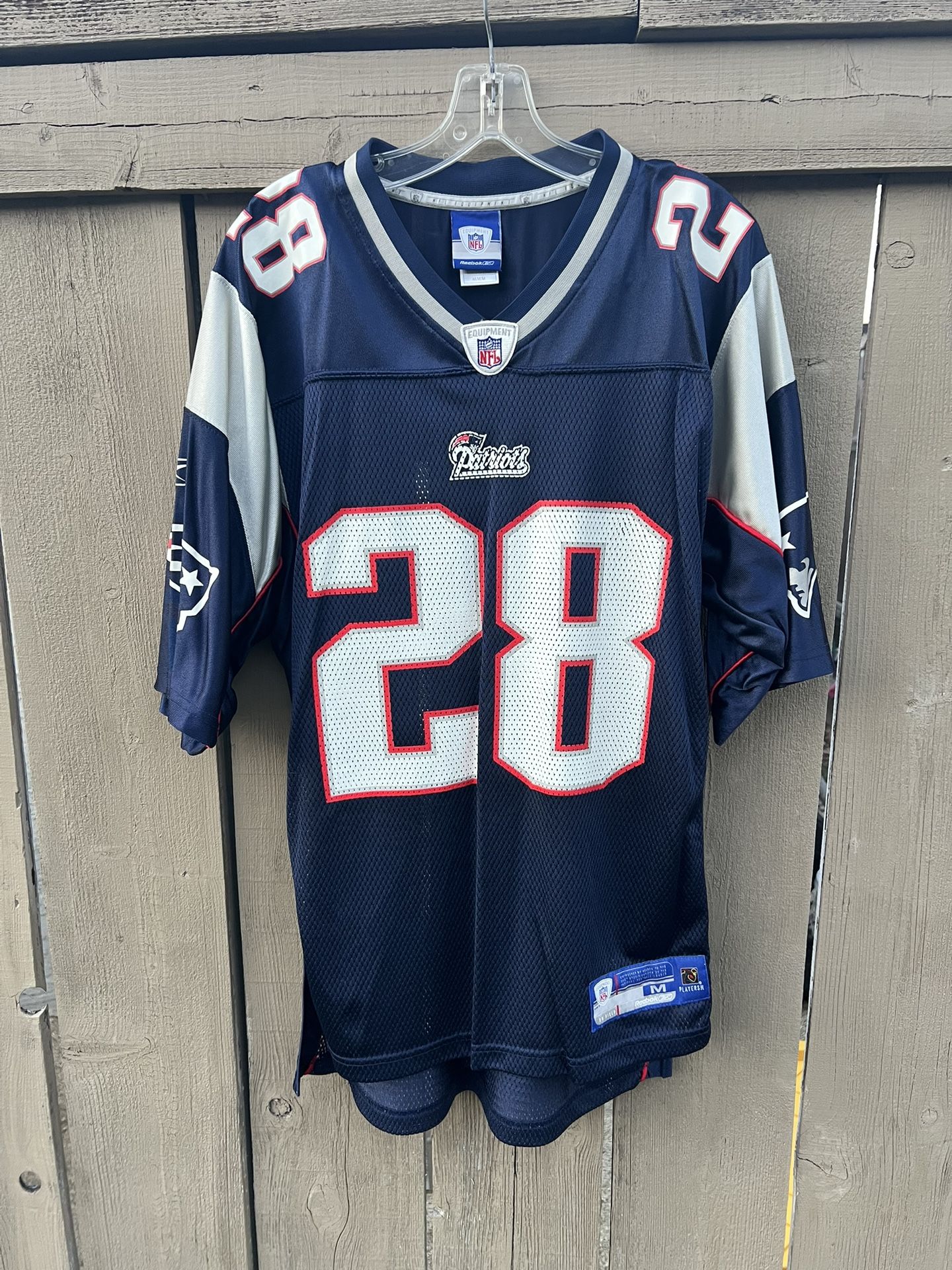 This is a Vintage New England Patriots Corey Dillon #28 NFL Reebok Blue Jersey Size Medium. No rips holes tears or stains. The lettering and logos are printed on the jersey. No chipping peeling or cracking of the graphics on the jersey. This jersey is a MUST have if you're a fan of the New England Patriots or Corey Dillion. Overall this jersey is in EXCELLENT CONDITION. This item comes from a smoke and pet free home. Measurements are Approximate: Underarm to Underarm - 22" Top of the shirt to the bottom of the shirt - 28"
