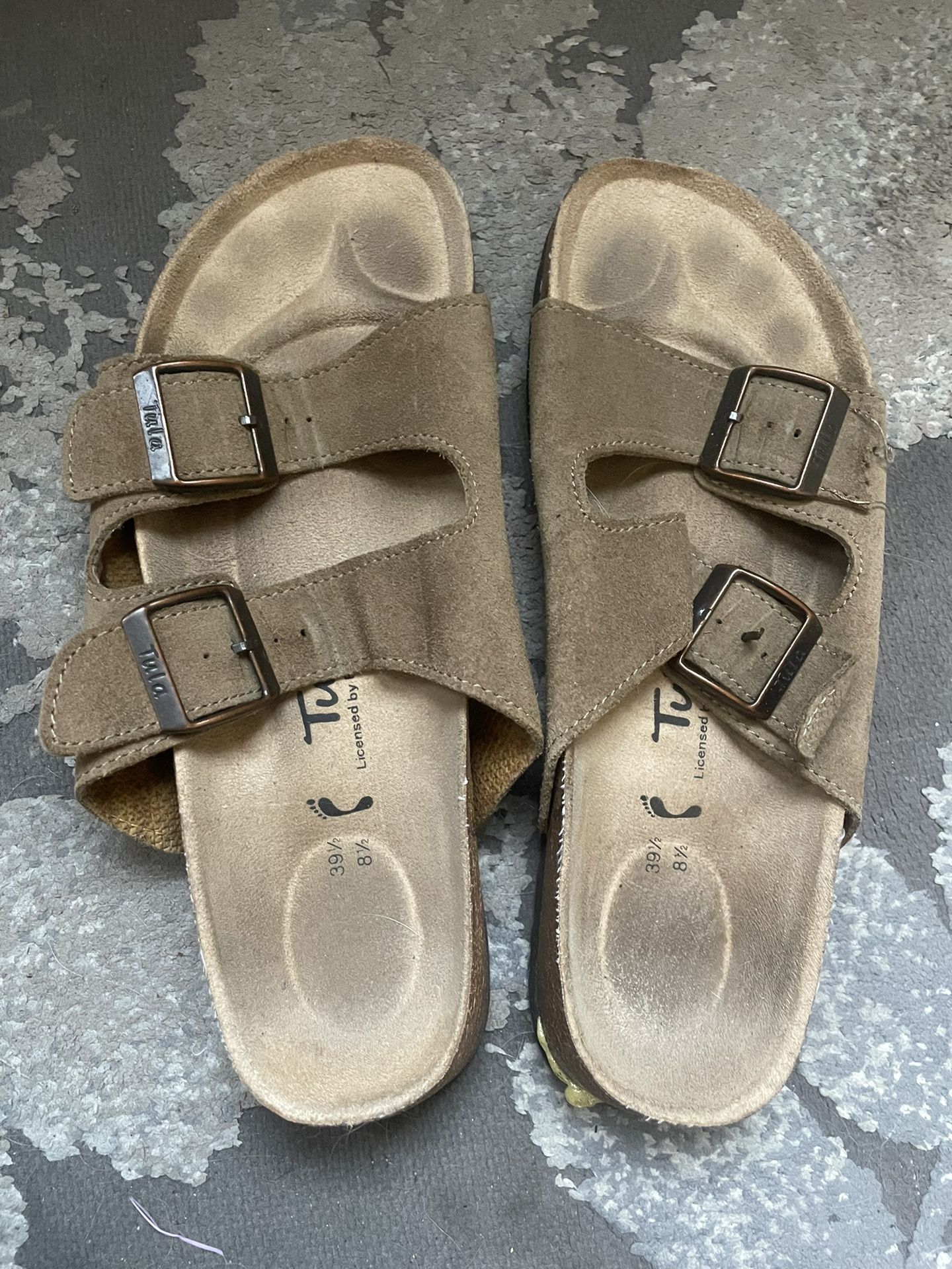 Used Tula size 8.5 Birkenstock style sandals. The right sandal is not the best condition. The heel separated from the shoe and a repair. Was trying to be done with gorilla glue. It wasn’t the best job. Please see photos also on the right shoe the top strap closer to the toes has been cut. Otherwise the souls of the shoes are in pretty good condition. Pick up in Scripps Ranch. Cash or Venmo only please at local pick up willing to ship through OfferUp.