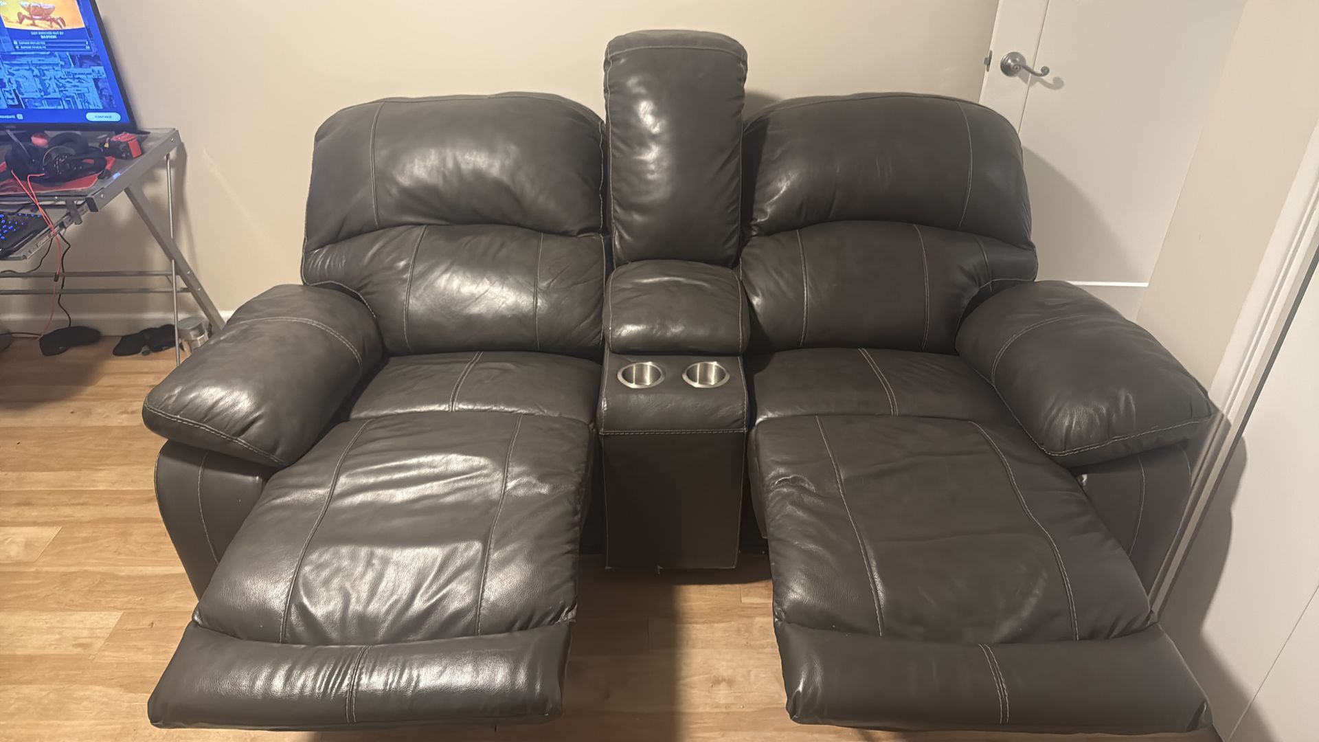 Height 40 1/2 inch Length 75 Had this couch for few years. Bought it brand new. black leather, both seats have a motorized recliner, and motorized head rest. Both on separate switch’s. When reclined fully it’s 75 inch’s, has cup holders usb charging ports on both sides. Has been steamed and cleaned. Some scratched from moving on the frame other than that it’s in great condition. I am also willing to help move. Note: there is a tear at the zipper. The lid for the remote case has a tear. But stuffing is still there no issues. $350 Or best offer