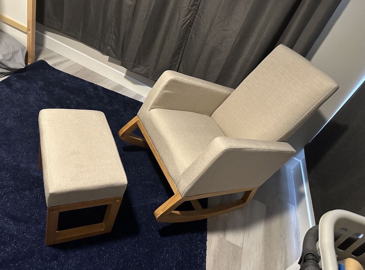 Comfortable nursery glider with matching ottoman in good used condition. Clean fabric, solid wood base, and smooth rocking motion. Great for nursery, reading corner, or bedroom.