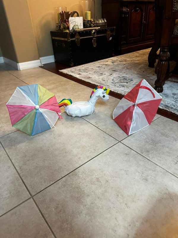 american girl doll unicorn float and beach umbrellas and american girl doll skis, doll not included
