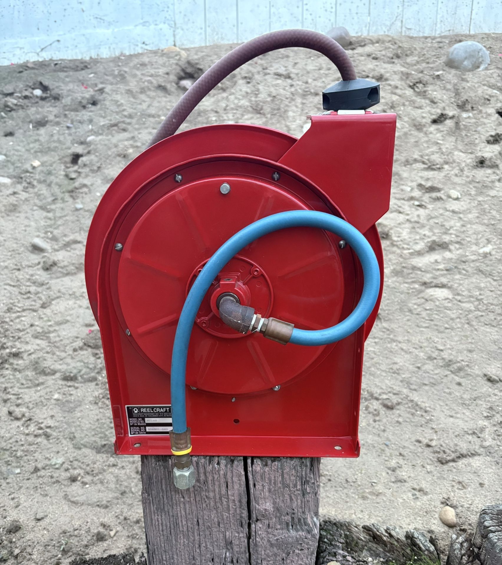 Reelcraft spring-retractable hose reel Durable and compact product used for managing air and water hoses in various applications. Constructed from all-steel components with a corrosion-resistant powder-coated finish for both air and water applications. Measurements: 3/8"x35' 300 PSI with 35’ hose Model number 6Z160; also identified as 5635 OLP EXCELLENT condition, works