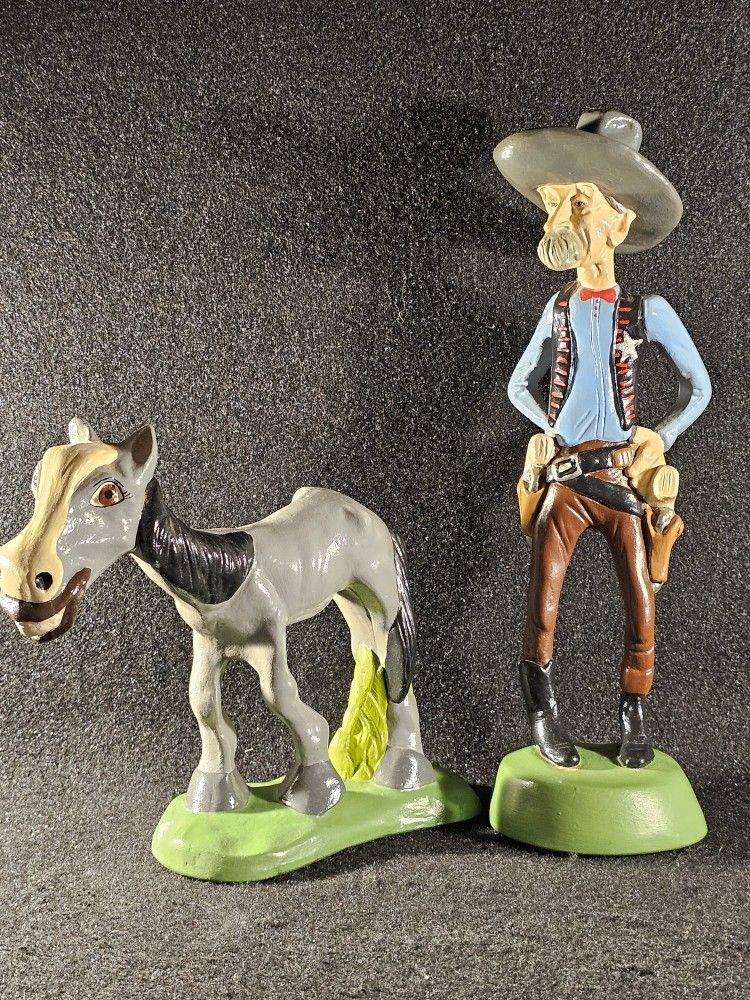 These are two very rare and very unique 1940s-era "Chalkware" detailed and hand painted figurines. You will not easily find either of these in these colors or conditions. Includes an old skinny, slightly bow-legged cowboy sheriff figure that stands at 14.5 inches tall. His companion is a skinny, painted horse that stands 9 inches tall. Both figures are a great addition to any home decor. Please see all photos of the hand-painted detail. Must pick up in Easley. Shipping may be possible at buyers' expense.
