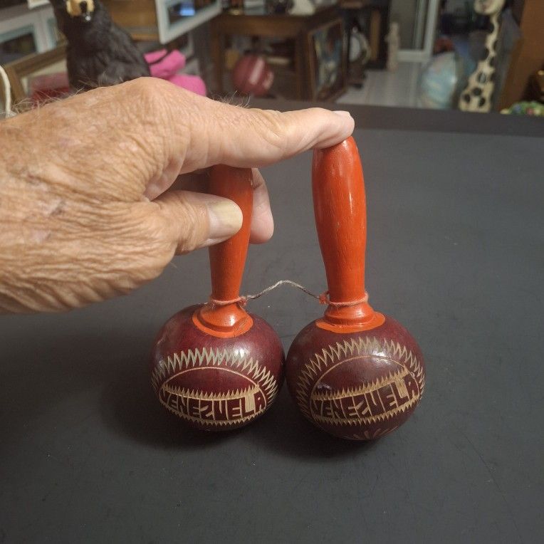 Venezuela Coconut Shell Hand-painted & Hand Etched Set Of 2 Maracas 5.5"