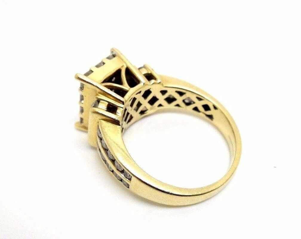 this extremely Flashy Ring will explode in the sunlight it features beautiful SHINY Princess diamonds and is a large style ring can be a cocktail ring or a large style engagement ring . will have everyone staring. Specifications composition: 14k Solid Yellow gold Diamond Weight: Approx 1.90ct Diamond Color Clarity: Approx H-G --si1-i1 Weight (in Grams); 6.8 g heavy size: 7.25" can be sized message before purchase Stock #32119