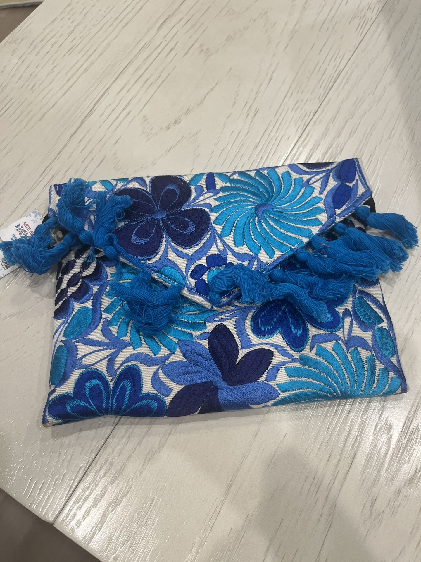 Beautiful boho-style clutch bag featuring detailed blue floral embroidery and decorative tassels. Perfect for casual outings, vacations, festivals, or dressing up a simple outfit. Details: • Vibrant blue embroidered floral design • Soft fabric with envelope-style flap • Decorative tassel accents • Lightweight and easy to carry • Condition: Very good (no visible tears or stains)