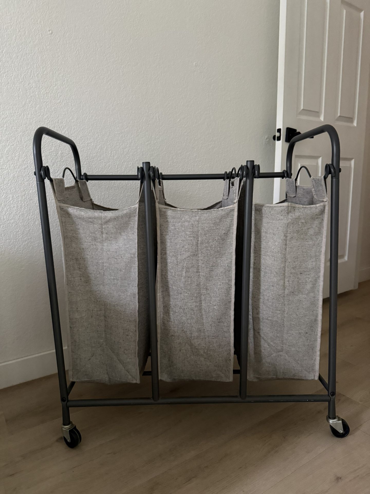 3 separate canvas laundry totes remove from frame if needed. Wheels make for easy transport. Don’t have space for it anymore $25 obo
