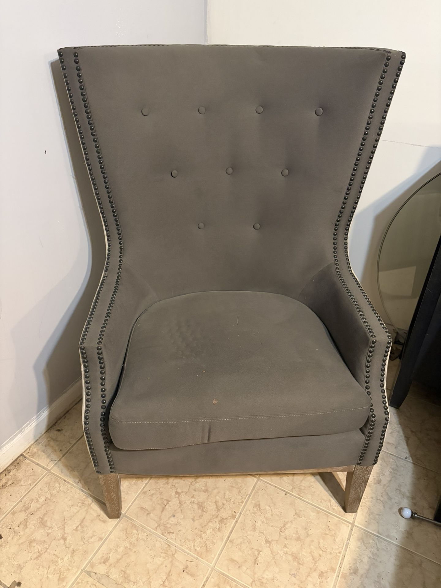 Gray wingback chair. Great condition. Dimensions: 46” height. 34” Length. 33” width. 22” Seat height.