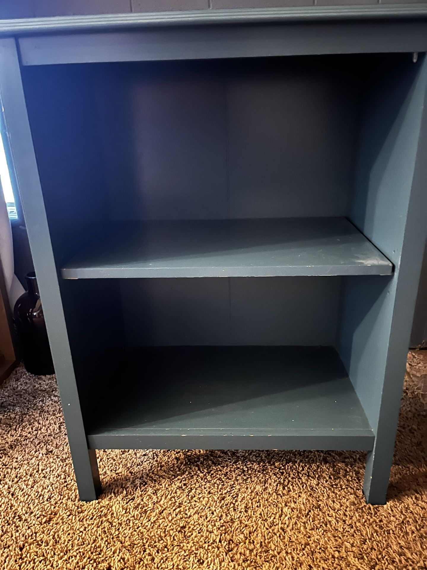 Thrifted Blue Book shelf Dimensions: About 30” H by 22 1/2 W Original price: $40 Can be dropped off for an extra $10! Cash or Venmo
