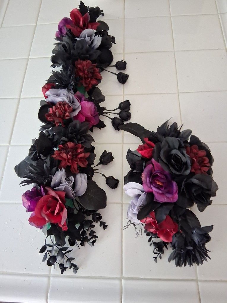 New and created by us. Beautiful back flowers along with some grey, burgundy red, and black leaves. Includes small swag for side of backdrop. Great for punk or goth wedding. More are available. Firm at $79 for both.