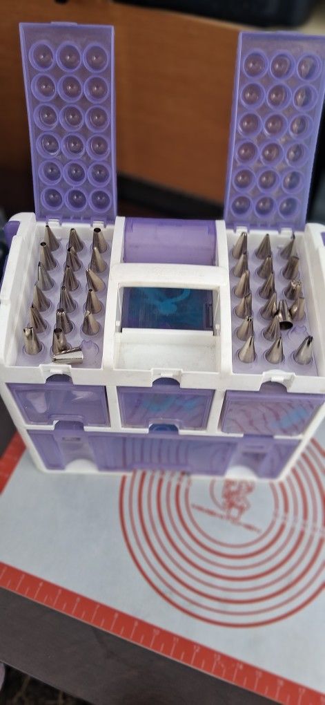 Including 2 mainstays cake carrier 2 turnstile all types of accessories a cake knife 2 silicone mime kitchen measuring placemats