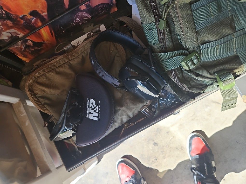 Smith and Wesson sunglasses with 3 different lenses Earplugs muffs Bail out bag /range bag can be used as sidebag or front chest bag has multiple uses ..this is a range go setup safety goggles an safety ear plugs ..do everything together 80 for it all is a deal..