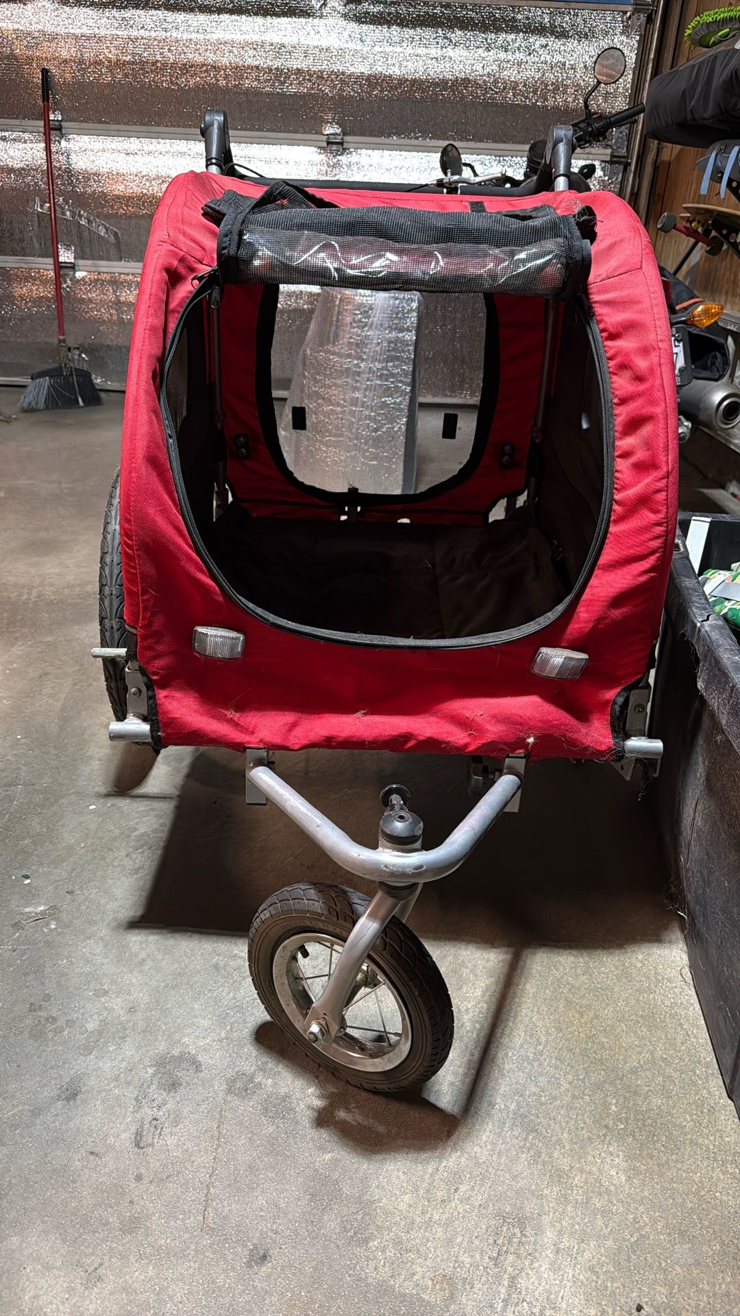Used dog stroller, it’s missing a screw for the front wheel and all the tires are flat, might just need air I haven’t used it in a long time, a bit dusty but still in good conditions. Can also be attached to a bicycle.