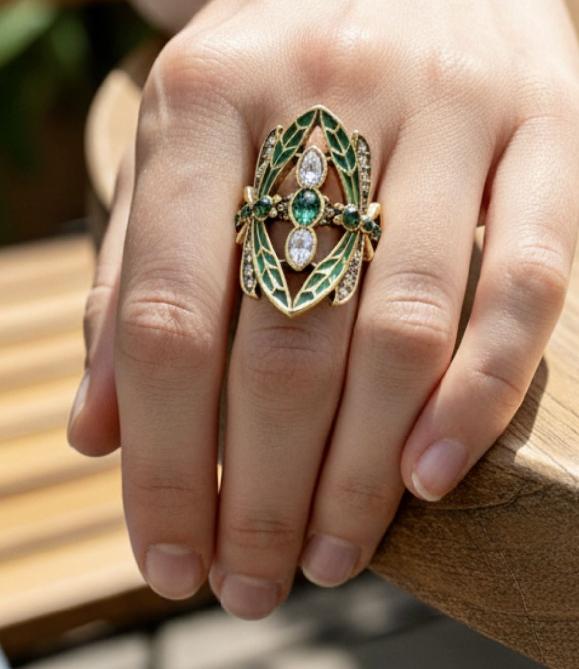 Vintage-Inspired Green Enamel and Crystal Statement Ring