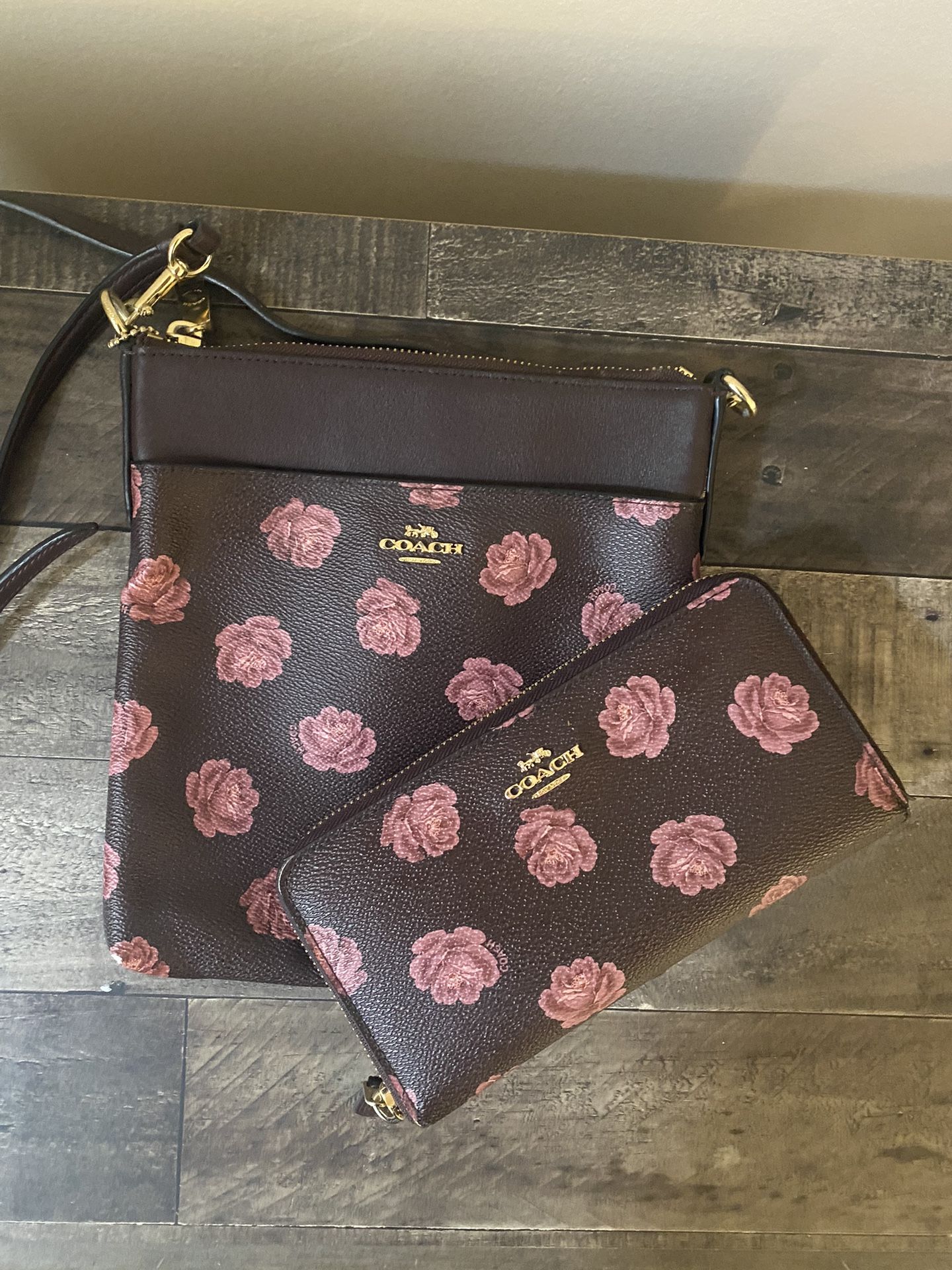 Brown with pink flowers coach crossbody bag with the matching wallet still in great condition. Coach purse - $70 Coach wallet - $30