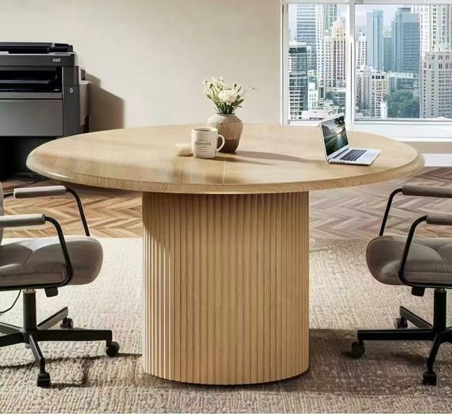 XK00817 47" Round Conference Table for 4, Farmhouse Wooden Meeting Room Table with Sturdy Fluted Metal Base, Modern Office Training Desk for Office, C