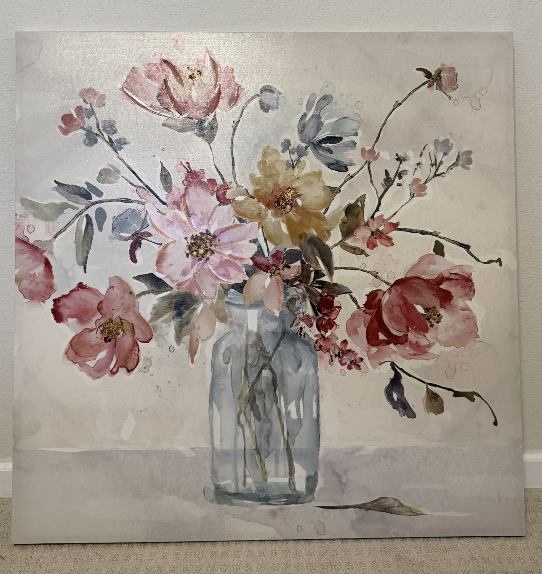 For Sale: 39.5” x 39.5” Textured Floral Canvas Art Beautiful oversized floral artwork featuring soft blush, rose, gold, and muted blue tones in a glass vase design. The piece has raised 3D accents on the petals and flower centers, adding depth, texture, and a subtle glossy finish that catches the light beautifully. Details: • Size: 39.5” x 39.5” • Textured canvas with dimensional 3D elements • Soft, neutral color palette that works with many décor styles • Ready to hang This statement piece is perfect for a living room, bedroom, entryway, or above a console or fireplace. Great condition and ready for its next home. Message me if interested!