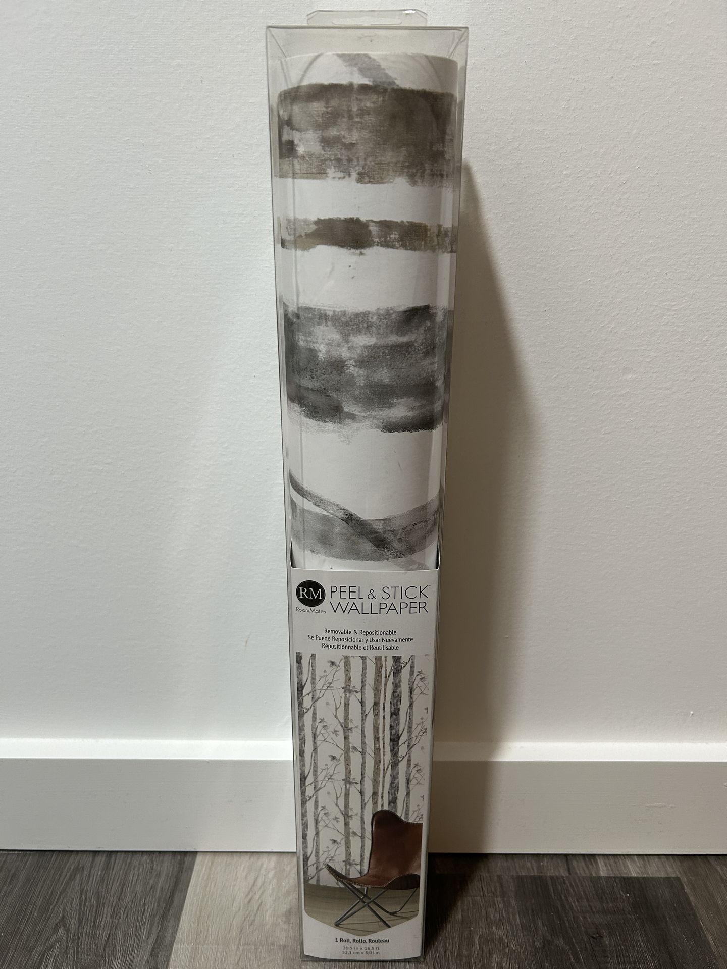 RoomMates Birch Trees Peel and Stick Wallpaper. White and brown. Removable, self-adhesive, repositionable, washable. Roll Size: 20.5”x 16.5’. Peel and stick to apply (no water, no paste, no mess). $15. Cash only.
