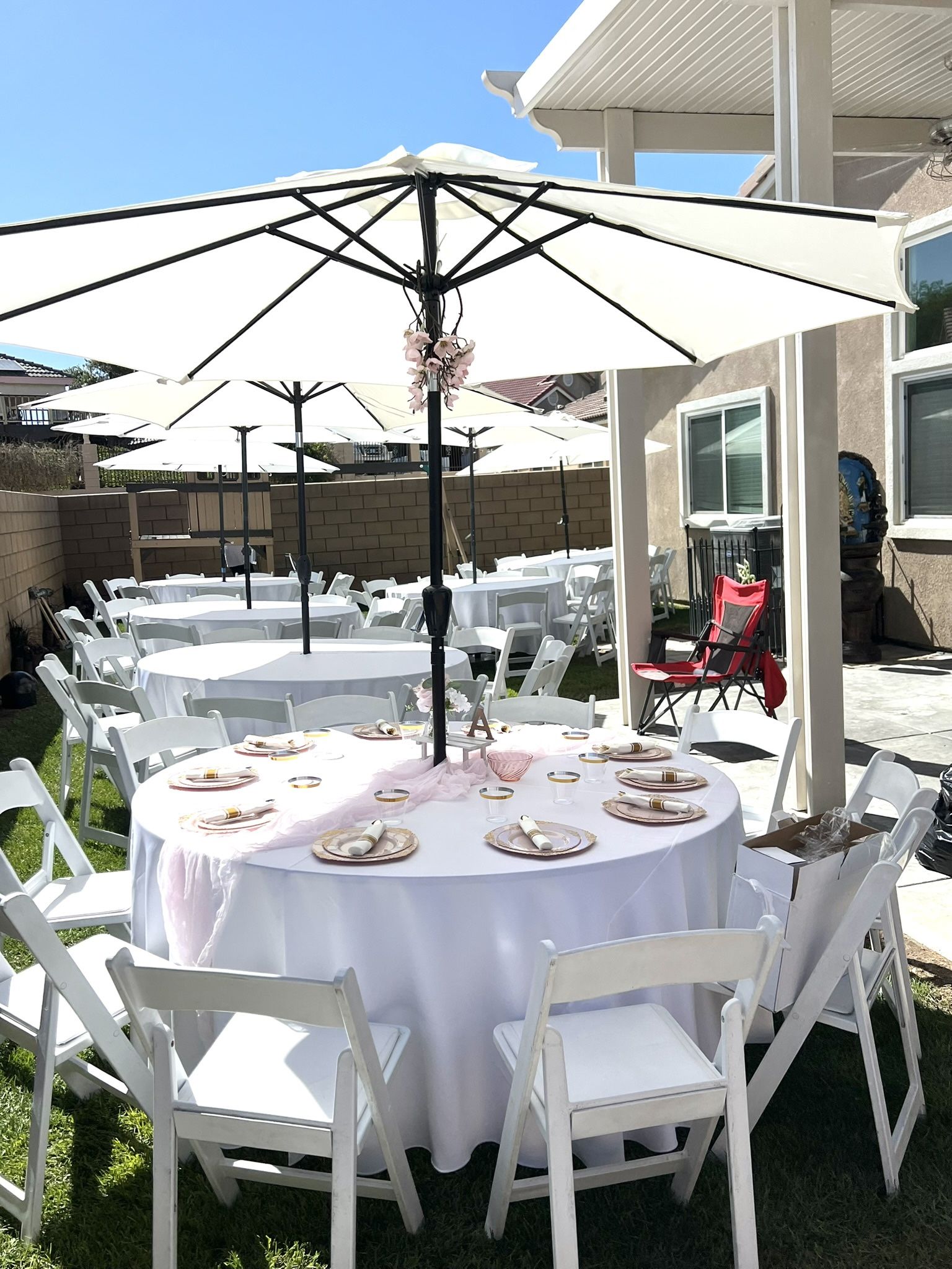 Umbrella sets includes tables, umbrella, plastic folding chairs, heaters and linens for your next party R. E. N. T. A. L. Adelanto, Victorville, phelan, apple valley, Little Rock, spring valley lake, oak hill, hisperia, piñon hills, wrightwood , lake Los Angeles , Pearblossom, sun village
