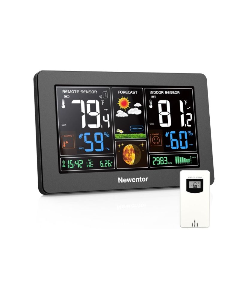 Newentor Weather Station Wireless Indoor Outdoor Thermometer, Color Display Digital Weather Thermometer with Atomic Clock, Barometric Pressure, Forecast Station with Adjustable Backlight, Black - New