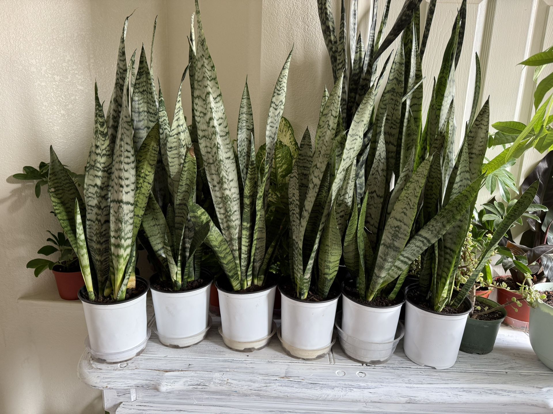 PLEASE 👉Only msg if you REALLY INTERESTED IN BUYING PLEASE 🙏 👉$30 EACH 👉7”WHITE Pot ♥️♥️NASA’s Study approved By releasing oxygen and adding moisture to the air, snake plants can help lessen the impact of airborne allergens like dust and dander. Since poor indoor air quality has been linked to many health-related issues like allergies, Itchy skin , Sore throat , short breath and asthma this is a definite benefit 💙💙 Mental Health Booster: Their aesthetic, upright foliage can reduce stress and increase productivity. 💙💙 Feng Shui: Often used to bring positive energy and "good vibes" into a home ♥️Snake Plants convert CO2 into oxygen at night (as opposed to most other plants) so they are the ideal plant to brighten up a bedroom and help you sleep better by breathing cleaner, oxygen-rich air all night long. 👉I HAVE TONS OF GORGEOUS PLANTS IN MY COLLECTION ♥️DESERT IN AND GRAND CANYON THANKS 🙏