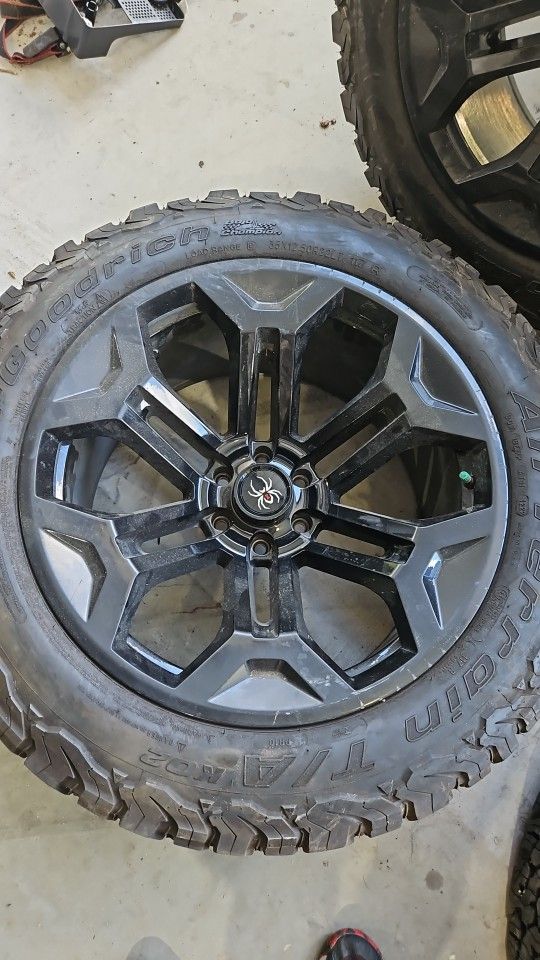 35x12.5x22 BFGoodrich baha with black widow 22x11 wheels and all caps. Tires have less than 16,000 Mike's, still have the mold tit's very nice PACKAGE! F150 6x135 boly pattern $1500 OBO will trade for raptor beadlocks wheels and tires If you pay the 1500 I'll throw in for free the coyote GIBSON exhaust worth 850 new !