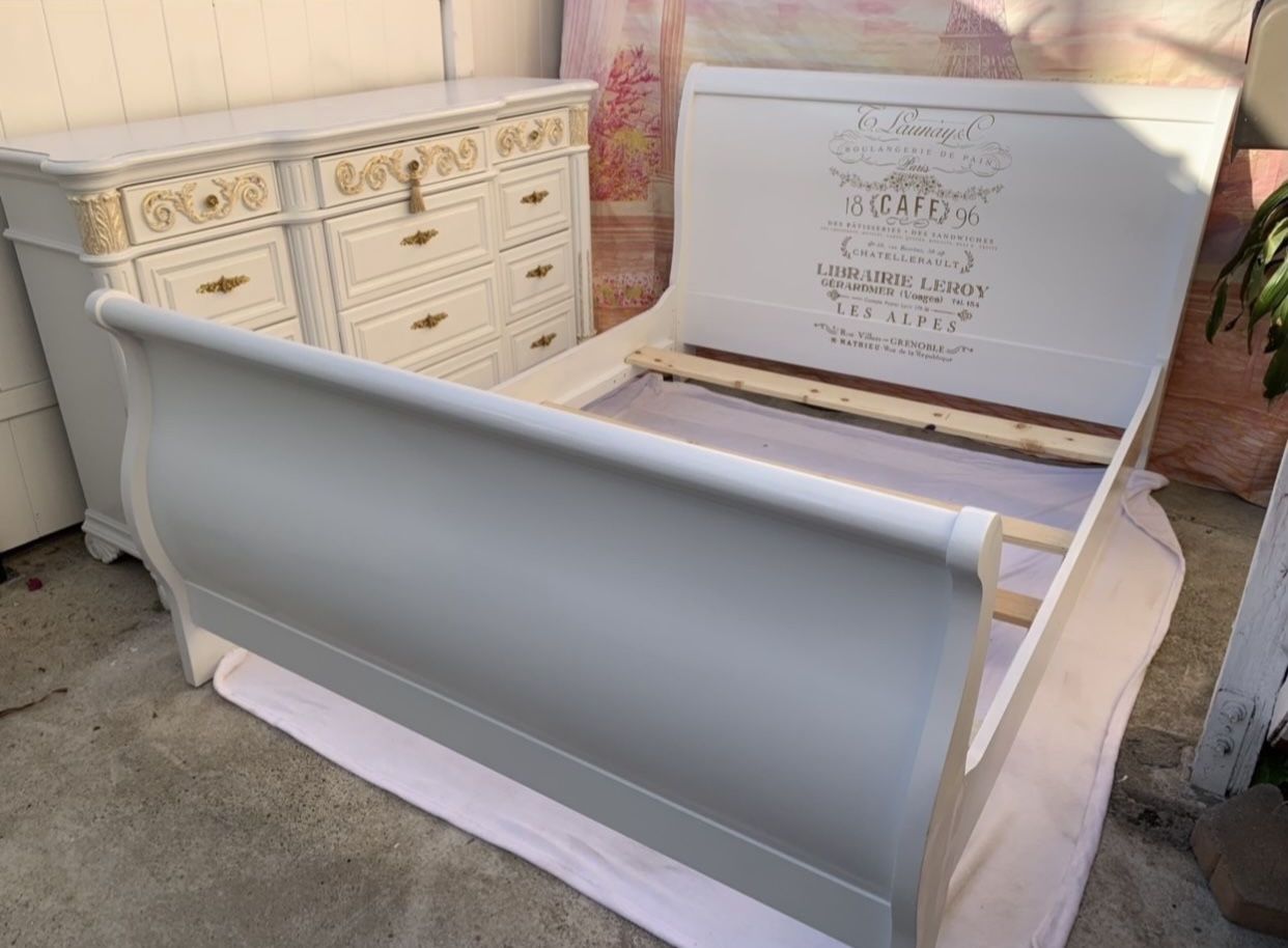 Wooden Queen size bedroom set French boho style colors white and gold! Set including bed frame with big wooden rails and wooden slants! Whole set has been refurbished isn’t new!!!! Bed frame on each side has the same crystal decor like two nightstands hardware ! Two large wooden nightstands French Boho style with mirrored designs with three wooden drawers each ! furniture has Been Refurbished painted by hand Hardware is new are crystals looks very beautiful 6.5 inches wide 26 inches wide 17 1/4 inches deep 28 5/8 inches tall ! Are big pieces Asking price for three Pieces only $940.00 firm price no negotiable is bed frame, two nightstands! Bedroom set has been painted by hand using primer,paint color, sealer, designs, new hardware! Delivery available an extra cost For pick up on national city San Diego Long dresser or credenza beside bed frame white and gold with twelve drawers is available for sale is huge and very heavy asking price $650.00 firm price This type of work is Art, it looks very nice!l If you see my post for this bedroom, it means that it is available